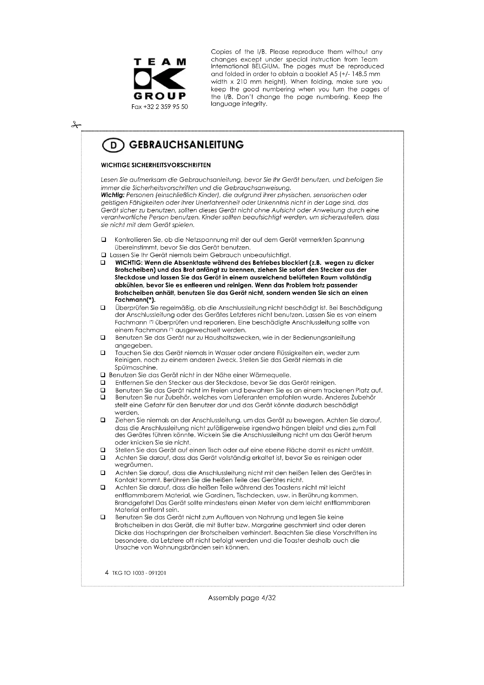 ausgewechselt werden. Benutzen Sie das Gerät nur zu Haushaltszwecken, wie in der Bedienungsanleitung angegeben. Tauchen Sie das Gerät niemals in Wasser oder andere Flüssigkeiten ein, weder zum Reinigen, noch zu einem anderen Zweck. Stellen Sie das Gerät niemals in die Spülmaschine. Benutzen Sie das Gerät nicht in der Nähe einer Wärmequelle. Entfernen Sie den Stecker aus der Steckdose, bevor Sie das Gerät reinigen. Benutzen Sie das Gerät nicht im Freien und bewahren Sie es an einem trockenen Platz auf. Benutzen Sie nur Zubehör, welches vom Lieferanten empfohlen wurde. Anderes Zubehör stellt eine Gefahr für den Benutzer dar und das Gerät könnte dadurch beschädigt werden. Ziehen Sie niemals an der Anschlussleitung, um das Gerät zu bewegen. Achten Sie darauf, dass die Anschlussleitung nicht zufälligerweise irgendwo hängen bleibt und dies zum Fall des Gerätes führen könnte. Wickeln Sie die Anschlussleitung nicht um das Gerät herum oder knicken Sie sie nicht. Stellen Sie das Gerät auf einen Tisch oder auf eine ebene Fläche damit es nicht umfällt. Achten Sie darauf, dass das Gerät vollständig erkaltet ist, bevor Sie es reinigen oder wegräumen. Achten Sie darauf, dass die Anschlussleitung nicht mit den heißen Teilen des Gerätes in Kontakt kommt. Berühren Sie die heißen Teile des Gerätes nicht. Achten Sie darauf, dass die heißen Teile während des Toastens nicht mit leicht entflammbarem Material, wie Gardinen, Tischdecken, usw. in Berührung kommen. Brandgefahr! Das Gerät sollte mindestens einen Meter von dem leicht entflammbaren Material entfernt sein. Benutzen Sie das Gerät nicht zum Auftauen von Nahrung und legen Sie keine Brotscheiben in das Gerät, die mit Butter bzw. Margarine geschmiert sind oder deren Dicke das Hochspringen der Brotscheiben verhindert. Beachten Sie diese Vorschriften ins besondere, da Letztere oft nicht befolgt werden und die Toaster deshalb auch die Ursache von Wohnungsbränden sein können. Copies of the I/B. Please reproduce them without any changes except under special instruction from Team International BELGIUM. The pages must be reproduced and folded in order to obtain a booklet A5 (+/- 148.5 mm width x 210 mm height). When folding, make sure you keep the good numbering when you turn the pages of the I/B. Don’t change the page numbering. Keep the language integrity.