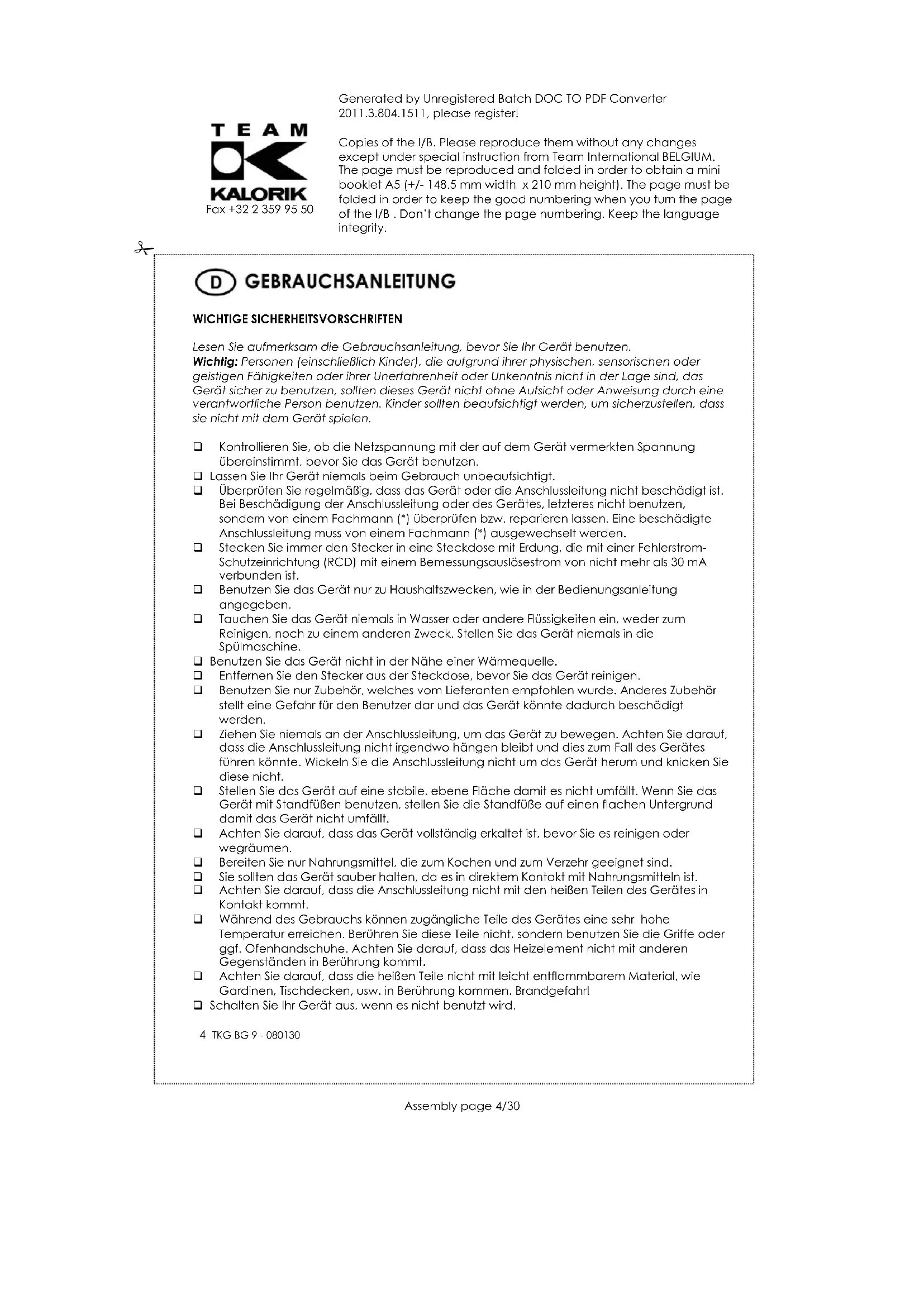 Zum Schutz unserer Umwelt und unserer Gesundheit sind Elektro- und Elektronik-Altgeräte nach bestimmten Regeln zu entsorgen. Dies fordert den Einsatz sowohl des Herstellers bzw. Lieferanten als auch des Verbrauchers. Aus diesem Grund darf dieses Gerät, wie das Symbol auf dem Typenschild bzw. auf der Verpackung zeigt, nicht in den unsortierten Restmüll gegeben werden. Der Verbraucher hat das Recht, dieses Gerät über kommunale Sammelstellen zu entsorgen; von dort aus wird die spezifische Behandlung, Verwertung bzw. das Recycling gem. den Erfordernissen der Richtlinie sichergestellt.Generated by Unregistered Batch DOC TO PDF Converter 2011.3.804.1511, please register! Copies of the I/B. Please reproduce them without any changes except under special instruction from Team International BELGIUM. The page must be reproduced and folded in order to obtain a mini booklet A5 (+/- 148.5 mm width x 210 mm height). The page must be folded in order to keep the good numbering when you turn the page of the I/B . Don’t change the page numbering. Keep the language integrity.