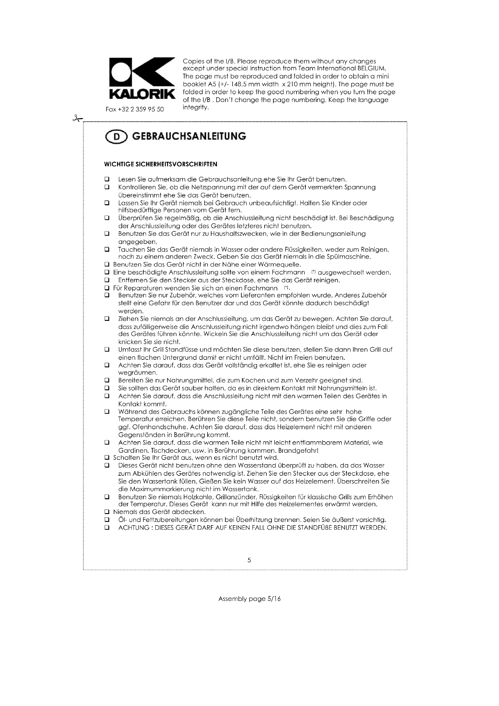 Benutzen Sie nur Zubehör, welches vom Lieferanten empfohlen wurde. Anderes Zubehör stellt eine Gefahr für den Benutzer dar und das Gerät könnte dadurch beschädigt werden. Ziehen Sie niemals an der Anschlussleitung, um das Gerät zu bewegen. Achten Sie darauf, dass zufälligerweise die Anschlussleitung nicht irgendwo hängen bleibt und dies zum Fall des Gerätes führen könnte. Wickeln Sie die Anschlussleitung nicht um das Gerät oder knicken Sie sie nicht. Umfasst Ihr Grill Standfüsse und möchten Sie diese benutzen, stellen Sie dann Ihren Grill auf einen flachen Untergrund damit er nicht umfällt. Nicht im Freien benutzen. Achten Sie darauf, dass das Gerät vollständig erkaltet ist, ehe Sie es reinigen oder wegräumen. Bereiten Sie nur Nahrungsmittel, die zum Kochen und zum Verzehr geeignet sind. Sie sollten das Gerät sauber halten, da es in direktem Kontakt mit Nahrungsmitteln ist. Achten Sie darauf, dass die Anschlussleitung nicht mit den warmen Teilen des Gerätes in Kontakt kommt. Während des Gebrauchs können zugängliche Teile des Gerätes eine sehr hohe Temperatur erreichen. Berühren Sie diese Teile nicht, sondern benutzen Sie die Griffe oder ggf. Ofenhandschuhe. Achten Sie darauf, dass das Heizelement nicht mit anderen Gegenständen in Berührung kommt. Achten Sie darauf, dass die warmen Teile nicht mit leicht entflammbarem Material, wie Gardinen, Tischdecken, usw. in Berührung kommen. Brandgefahr! Schalten Sie Ihr Gerät aus, wenn es nicht benutzt wird. Dieses Gerät nicht benutzen ohne den Wasserstand überprüft zu haben, da das Wasser zum Abkühlen des Gerätes notwendig ist. Ziehen Sie den Stecker aus der Steckdose, ehe Sie den Wassertank füllen. Gießen Sie kein Wasser auf das Heizelement. Überschreiten Sie die Maximummarkierung nicht im Wassertank. Benutzen Sie niemals Holzkohle, Grillanzünder, Flüssigkeiten für klassische Grills zum Erhöhen der Temperatur. Dieses Gerät kann nur mit Hilfe des Heizelementes erwärmt werden. Niemals das Gerät abdecken. Öl- und Fettzubereitungen können bei Überhitzung brennen. Seien Sie äußerst vorsichtig. ACHTUNG : DIESES GERÄT DARF AUF KEINEN FALL OHNE DIE STANDFÜßE BENUTZT WERDEN.Copies of the I/B. Please reproduce them without any changes except under special instruction from Team International BELGIUM. The page must be reproduced and folded in order to obtain a mini booklet A5 (+/- 148.5 mm width x 210 mm height). The page must be folded in order to keep the good numbering when you turn the page of the I/B . Don’t change the page numbering. Keep the language integrity.