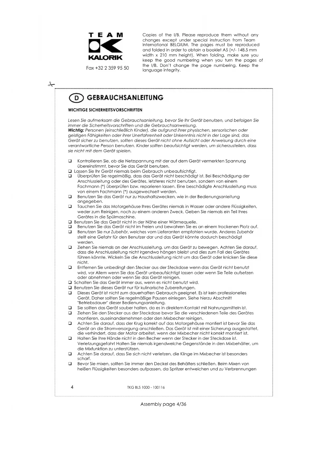 WICHTIGE SICHERHEITSVORSCHRIFTEN Lesen Sie aufmerksam die Gebrauchsanleitung, bevor Sie Ihr Gerät benutzen, und befolgen Sie immer die Sicherheitsvorschriften und die Gebrauchsanweisung. Wichtig: Personen (einschließlich Kinder), die aufgrund ihrer physischen, sensorischen oder geistigen Fähigkeiten oder ihrer Unerfahrenheit oder Unkenntnis nicht in der Lage sind, das Gerät sicher zu benutzen, sollten dieses Gerät nicht ohne Aufsicht oder Anweisung durch eine verantwortliche Person benutzen. Kinder sollten beaufsichtigt werden, um sicherzustellen, dass sie nicht mit dem Gerät spielen. Kontrollieren Sie, ob die Netzspannung mit der auf dem Gerät vermerkten Spannung übereinstimmt, bevor Sie das Gerät benutzen. Lassen Sie Ihr Gerät niemals beim Gebrauch unbeaufsichtigt. Überprüfen Sie regelmäßig, dass das Gerät nicht beschädigt ist. Bei Beschädigung der Anschlussleitung oder des Gerätes, letzteres nicht benutzen, sondern von einem Fachmann (*) überprüfen bzw. reparieren lassen. Eine beschädigte Anschlussleitung muss von einem Fachmann (*) ausgewechselt werden. Benutzen Sie das Gerät nur zu Haushaltszwecken, wie in der Bedienungsanleitung angegeben. Tauchen Sie das Motorgehäuse Ihres Gerätes niemals in Wasser oder andere Flüssigkeiten, weder zum Reinigen, noch zu einem anderen Zweck. Geben Sie niemals ein Teil Ihres Gerätes in die Spülmaschine. Benutzen Sie das Gerät nicht in der Nähe einer Wärmequelle. Benutzen Sie das Gerät nicht im Freien und bewahren Sie es an einem trockenen Platz auf. Benutzen Sie nur Zubehör, welches vom Lieferanten empfohlen wurde. Anderes Zubehör stellt eine Gefahr für den Benutzer dar und das Gerät könnte dadurch beschädigt werden. Ziehen Sie niemals an der Anschlussleitung, um das Gerät zu bewegen. Achten Sie darauf, dass die Anschlussleitung nicht irgendwo hängen bleibt und dies zum Fall des Gerätes führen könnte. Wickeln Sie die Anschlussleitung nicht um das Gerät oder knicken Sie diese nicht. Entfernen Sie unbedingt den Stecker aus der Steckdose wenn das Gerät nicht benutzt wird, vor Allem wenn Sie das Gerät unbeaufsichtigt lassen oder wenn Sie Teile aufsetzen oder abnehmen oder wenn Sie das Gerät reinigen. Schalten Sie das Gerät immer aus, wenn es nicht benutzt wird. Benutzen Sie dieses Gerät nur für kulinarische Zubereitungen. Dieses Gerät ist nicht zum dauerhaften Gebrauch geeignet. Es ist kein professionelles Gerät. Daher sollten Sie regelmäßige Pausen einlegen. Siehe hierzu Abschnitt "Betriebsdauer" dieser Bedienungsanleitung. Sie sollten das Gerät sauber halten, da es in direktem Kontakt mit Nahrungsmitteln ist. Ziehen Sie den Stecker aus der Steckdose bevor Sie die verschiedenen Teile des Gerätes montieren, auseinandernehmen oder den Mixbecher reinigen. Achten Sie darauf, dass der Krug korrekt auf das Motorgehäuse montiert ist bevor Sie das Gerät an die Stromversorgung anschließen. Das Gerät ist mit einer Sicherung ausgestattet, die verhindert, dass der Motor arbeitet, wenn der Mixbecher nicht korrekt montiert ist. Halten Sie Ihre Hände nicht in den Becher wenn der Stecker in der Steckdose ist. Verletzungsgefahr! Halten Sie niemals irgendwelche Gegenstände in den Mixbehälter, um die Mixfunktion zu unterstützen. Achten Sie darauf, dass Sie sich nicht verletzen, die Klinge im Mixbecher ist besonders scharf. Bevor Sie mixen, sollten Sie immer den Deckel des Behälters schließen. Beim Mixen von heißen Flüssigkeiten besonders aufpassen, da Spritzer entweichen und zu Verbrennungen Copies of the I/B. Please reproduce them without any changes except under special instruction from Team International BELGIUM. The pages must be reproduced and folded in order to obtain a booklet A5 (+/- 148.5 mm width x 210 mm height). When folding, make sure you keep the good numbering when you turn the pages of the I/B. Don’t change the page numbering. Keep the language integrity.