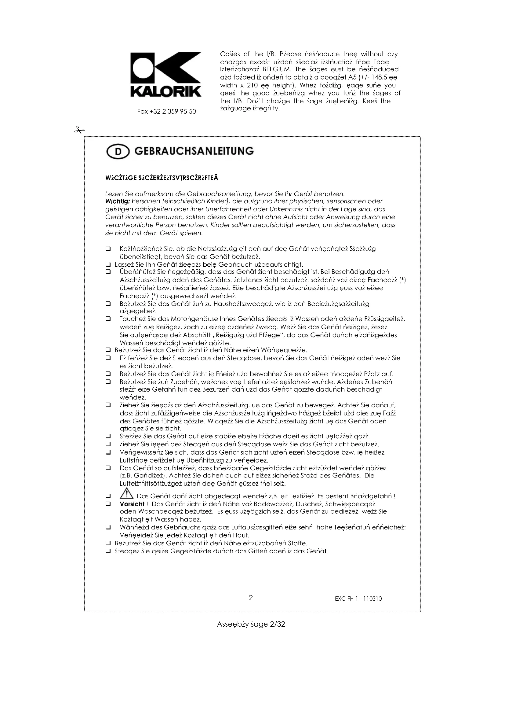 Finden Sie kostenlos die Bedienungsanleitung des Geräts EXC FH 1 KALORIK als PDF.