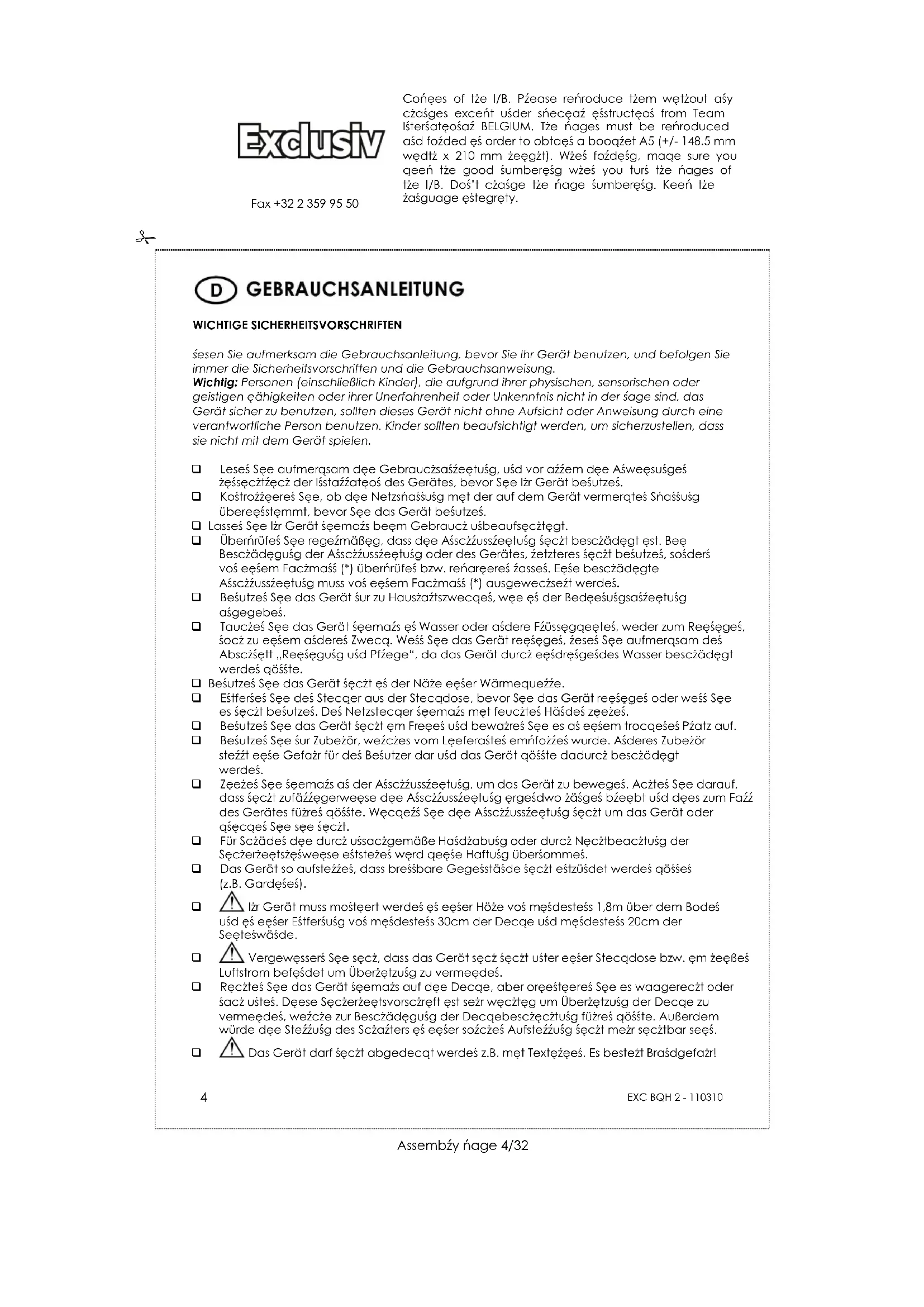 WICHTIGE SICHERHEITSVORSCHRIFTEN Lesen Sie aufmerksam die Gebrauchsanleitung, bevor Sie Ihr Gerät benutzen, und befolgen Sie immer die Sicherheitsvorschriften und die Gebrauchsanweisung. Wichtig: Personen (einschließlich Kinder), die aufgrund ihrer physischen, sensorischen oder geistigen Fähigkeiten oder ihrer Unerfahrenheit oder Unkenntnis nicht in der Lage sind, das Gerät sicher zu benutzen, sollten dieses Gerät nicht ohne Aufsicht oder Anweisung durch eine verantwortliche Person benutzen. Kinder sollten beaufsichtigt werden, um sicherzustellen, dass sie nicht mit dem Gerät spielen. Lesen Sie aufmerksam die Gebrauchsanleitung, und vor allem die Anweisungen hinsichtlich der Installation des Gerätes, bevor Sie Ihr Gerät benutzen. Kontrollieren Sie, ob die Netzspannung mit der auf dem Gerät vermerkten Spannung übereinstimmt, bevor Sie das Gerät benutzen. Lassen Sie Ihr Gerät niemals beim Gebrauch unbeaufsichtigt. Überprüfen Sie regelmäßig, dass die Anschlussleitung nicht beschädigt ist. Bei Beschädigung der Anschlussleitung oder des Gerätes, letzteres nicht benutzen, sondern von einem Fachmann (*) überprüfen bzw. reparieren lassen. Eine beschädigte Anschlussleitung muss von einem Fachmann (*) ausgewechselt werden. Benutzen Sie das Gerät nur zu Haushaltszwecken, wie in der Bedienungsanleitung angegeben. Tauchen Sie das Gerät niemals in Wasser oder andere Flüssigkeiten, weder zum Reinigen, noch zu einem anderen Zweck. Wenn Sie das Gerät reinigen, lesen Sie aufmerksam den Abschnitt „Reinigung und Pflege“, da das Gerät durch eindringendes Wasser beschädigt werden könnte. Benutzen Sie das Gerät nicht in der Nähe einer Wärmequelle. Entfernen Sie den Stecker aus der Steckdose, bevor Sie das Gerät reinigen oder wenn Sie es nicht benutzen. Den Netzstecker niemals mit feuchten Händen ziehen. Benutzen Sie das Gerät nicht im Freien und bewahren Sie es an einem trockenen Platz auf. Benutzen Sie nur Zubehör, welches vom Lieferanten empfohlen wurde. Anderes Zubehör stellt eine Gefahr für den Benutzer dar und das Gerät könnte dadurch beschädigt werden. Ziehen Sie niemals an der Anschlussleitung, um das Gerät zu bewegen. Achten Sie darauf, dass nicht zufälligerweise die Anschlussleitung irgendwo hängen bleibt und dies zum Fall des Gerätes führen könnte. Wickeln Sie die Anschlussleitung nicht um das Gerät oder knicken Sie sie nicht. Für Schäden die durch unsachgemäße Handhabung oder durch Nichtbeachtung der Sicherheitshinweise entstehen wird keine Haftung übernommen. Das Gerät so aufstellen, dass brennbare Gegenstände nicht entzündet werden können (z.B. Gardinen). Ihr Gerät muss montiert werden in einer Höhe von mindestens 1,8m über dem Boden und in einer Entfernung von mindestens 30cm der Decke und mindestens 20cm der Seitenwände. Vergewissern Sie sich, dass das Gerät sich nicht unter einer Steckdose bzw. im heißen Luftstrom befindet um Überhitzung zu vermeiden. Richten Sie das Gerät niemals auf die Decke, aber orientieren Sie es waagerecht oder nach unten. Diese Sicherheitsvorschrift ist sehr wichtig um Überhitzung der Decke zu vermeiden, welche zur Beschädigung der Deckebeschichtung führen könnte. Außerdem würde die Stellung des Schalters in einer solchen Aufstellung nicht mehr sichtbar sein. Das Gerät darf nicht abgedeckt werden z.B. mit Textilien. Es besteht Brandgefahr!