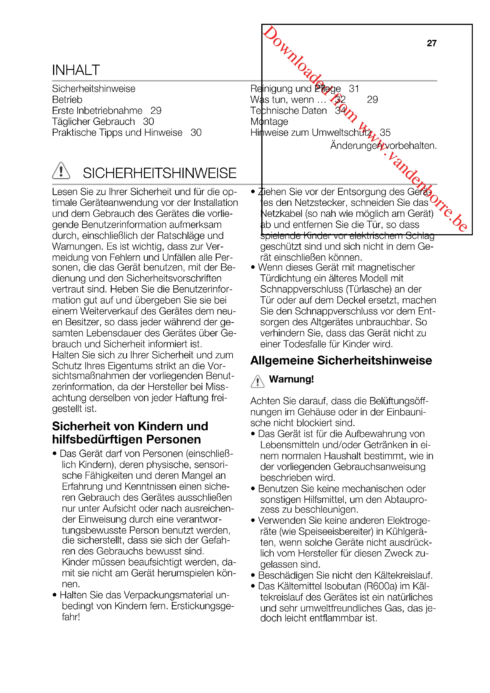pareil et les côtés. Veillez à garantir une circulation d'air suffi- sante à l'arrière de l'appareil. EN MATIÈRE DE SAUVEGARDE DE L'ENVIRONNEMENT Le symbole sur le produit ou son emballage indique que ce produit ne peut être traité comme déchet ménager. Il doit être remis au point de collecte dédié à cet effet (collecte et recyclage du matériel électrique et électronique). En procédant à la mise au rebut de l'appareil dans les règles de l’art, nous préservons l'environnement et notre sécurité, s’assurant ainsi que les déchets seront traités dans des conditions optimum. Pour obtenir plus de détails sur le recyclage de ce produit, veuillez prendre contact avec les services de votre commune ou le magasin où vous avez effectué l'achat. 26Downloaded from www.vandenborre.be INHALT Sicherheitshinweise 27 Betrieb 29 Erste Inbetriebnahme 29 Täglicher Gebrauch 30 Praktische Tipps und Hinweise 30 Reinigung und Pflege 31 Was tun, wenn … 32 Technische Daten 34 Montage 34 Hinweise zum Umweltschutz 35 Änderungen vorbehalten. SICHERHEITSHINWEISE Lesen Sie zu Ihrer Sicherheit und für die op- timale Geräteanwendung vor der Installation und dem Gebrauch des Gerätes die vorlie- gende Benutzerinformation aufmerksam durch, einschließlich der Ratschläge und Warnungen. Es ist wichtig, dass zur Ver- meidung von Fehlern und Unfällen alle Per- sonen, die das Gerät benutzen, mit der Be- dienung und den Sicherheitsvorschriften vertraut sind. Heben Sie die Benutzerinfor- mation gut auf und übergeben Sie sie bei einem Weiterverkauf des Gerätes dem neu- en Besitzer, so dass jeder während der ge- samten Lebensdauer des Gerätes über Ge- brauch und Sicherheit informiert ist. Halten Sie sich zu Ihrer Sicherheit und zum Schutz Ihres Eigentums strikt an die Vor- sichtsmaßnahmen der vorliegenden Benut- zerinformation, da der Hersteller bei Miss- achtung derselben von jeder Haftung frei- gestellt ist. Sicherheit von Kindern und hilfsbedürftigen Personen