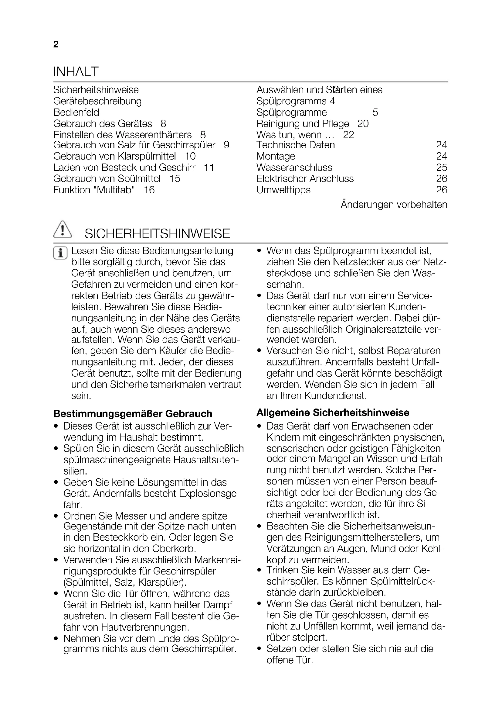www.fust.chINHALT Sicherheitshinweise 2 Gerätebeschreibung 4 Bedienfeld 5 Gebrauch des Gerätes 8 Einstellen des Wasserenthärters 8 Gebrauch von Salz für Geschirrspüler 9 Gebrauch von Klarspülmittel 10 Laden von Besteck und Geschirr 11 Gebrauch von Spülmittel 15 Funktion "Multitab" 16 Auswählen und Starten eines Spülprogramms 17 Spülprogramme 19 Reinigung und Pflege 20 Was tun, wenn … 22 Technische Daten 24 Montage 24 Wasseranschluss 25 Elektrischer Anschluss 26 Umwelttipps 26 Änderungen vorbehalten SICHERHEITSHINWEISE Lesen Sie diese Bedienungsanleitung bitte sorgfältig durch, bevor Sie das Gerät anschließen und benutzen, um Gefahren zu vermeiden und einen kor- rekten Betrieb des Geräts zu gewähr- leisten. Bewahren Sie diese Bedie- nungsanleitung in der Nähe des Geräts auf, auch wenn Sie dieses anderswo aufstellen. Wenn Sie das Gerät verkau- fen, geben Sie dem Käufer die Bedie- nungsanleitung mit. Jeder, der dieses Gerät benutzt, sollte mit der Bedienung und den Sicherheitsmerkmalen vertraut sein. Bestimmungsgemäßer Gebrauch