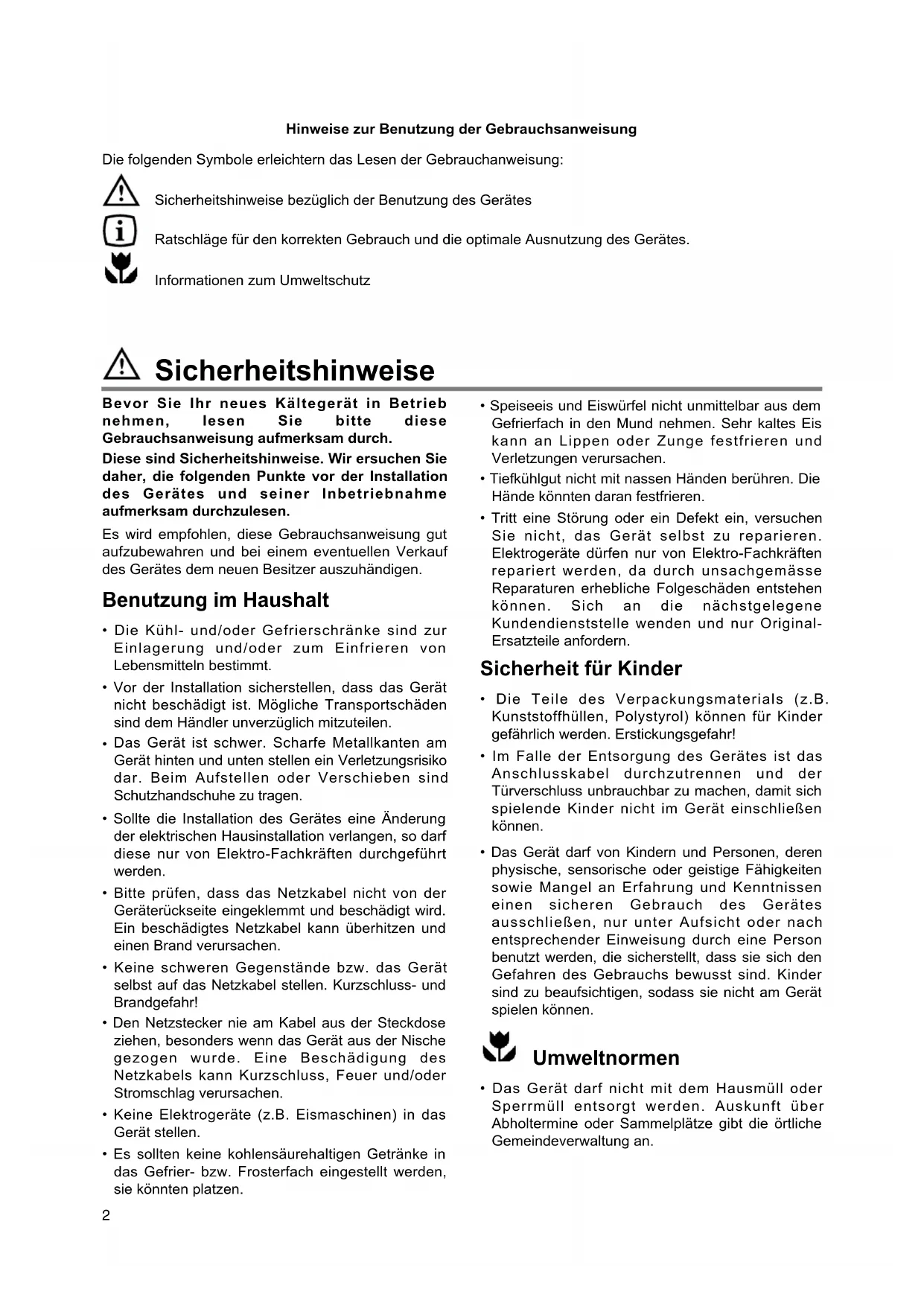www. .ch EKI 1220-IB2 Sicherheitshinweise Bevor Sie Ihr neues Kältegerät in Betrieb nehmen, lesen Sie bitte diese Gebrauchsanweisung aufmerksam durch. Diese sind Sicherheitshinweise. Wir ersuchen Sie daher, die folgenden Punkte vor der Installation des Gerätes und seiner Inbetriebnahme aufmerksam durchzulesen. Es wird empfohlen, diese Gebrauchsanweisung gut aufzubewahren und bei einem eventuellen Verkauf des Gerätes dem neuen Besitzer auszuhändigen. Benutzung im Haushalt