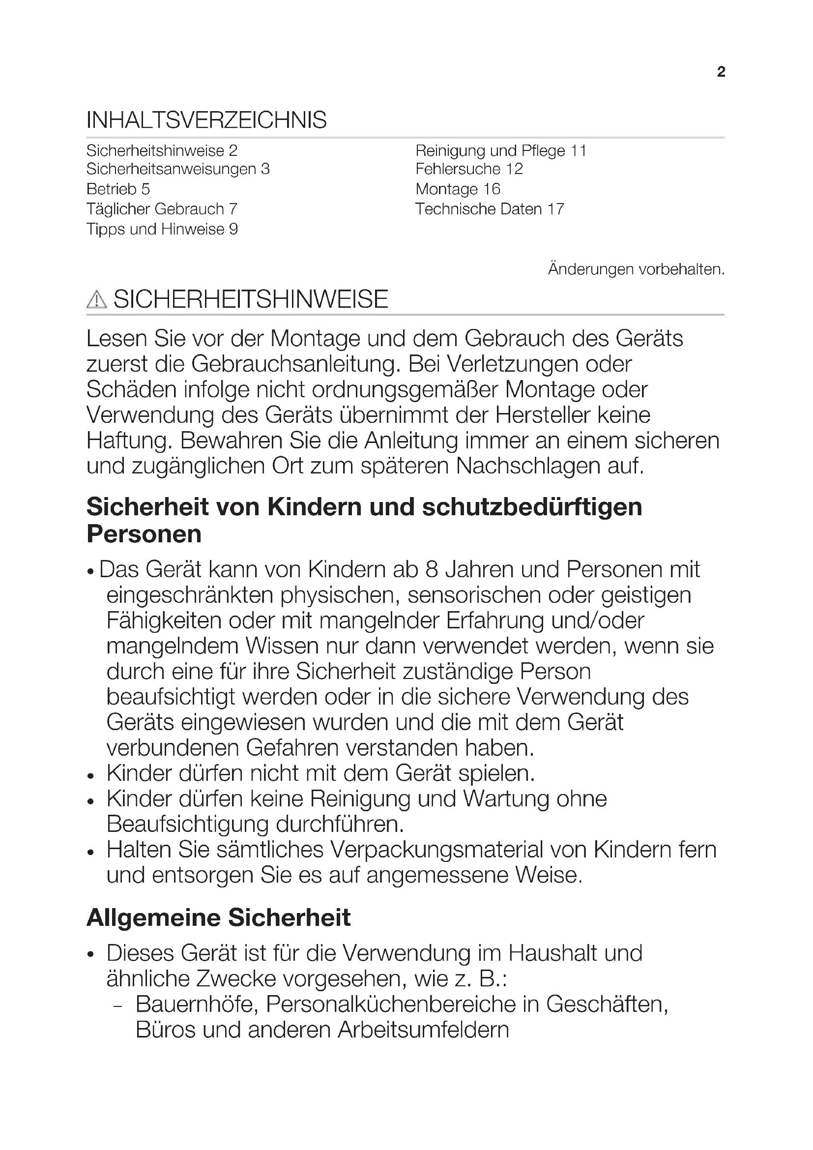 EKI1226-IB Benutzerinformation Notice d'utilisation Istruzioni per l’uso User Manual Kühlschrank Réfrigérateur Frigorifero RefrigeratorINHALTSVERZEICHNIS Sicherheitshinweise 2 Sicherheitsanweisungen 3 Betrieb 5 Täglicher Gebrauch 7 Tipps und Hinweise 9 Reinigung und Pflege 11 Fehlersuche 12 Montage 16 Technische Daten 17 Änderungen vorbehalten. SICHERHEITSHINWEISE Lesen Sie vor der Montage und dem Gebrauch des Geräts zuerst die Gebrauchsanleitung. Bei Verletzungen oder Schäden infolge nicht ordnungsgemäßer Montage oder Verwendung des Geräts übernimmt der Hersteller keine Haftung. Bewahren Sie die Anleitung immer an einem sicheren und zugänglichen Ort zum späteren Nachschlagen auf. Sicherheit von Kindern und schutzbedürftigen Personen