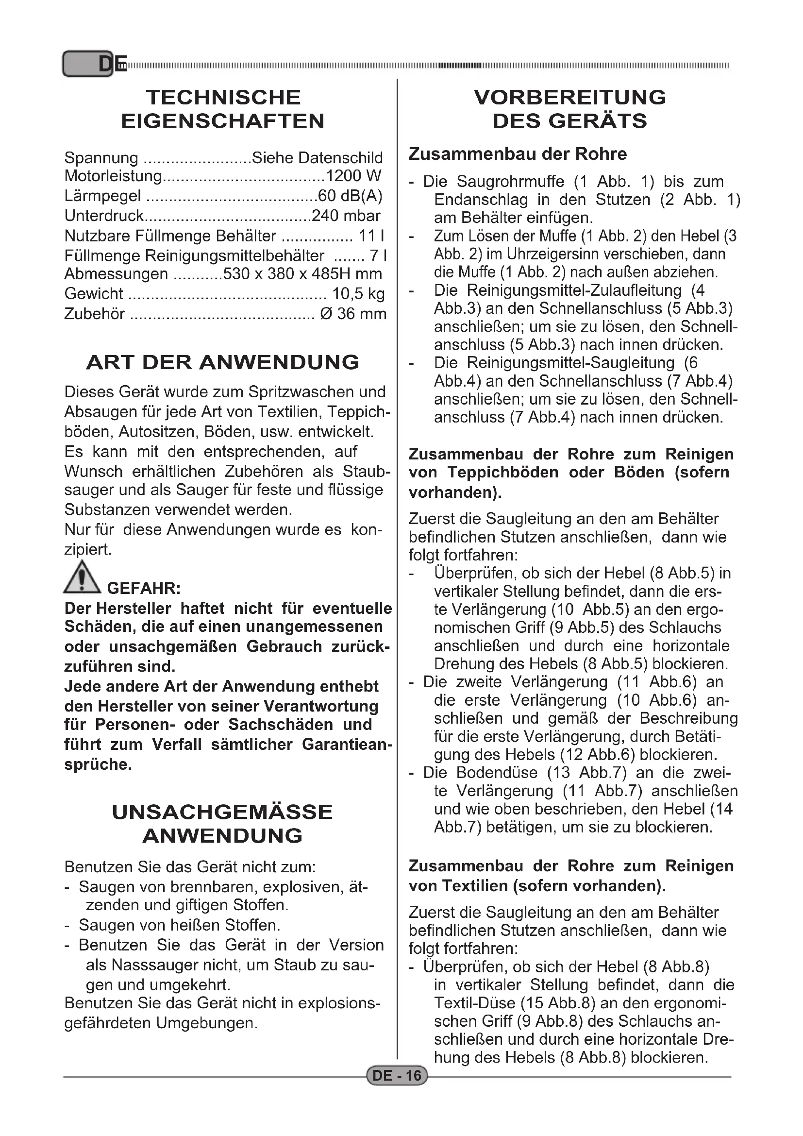 Dieses Gerät wurde zum Spritzwaschen und Absaugen für jede Art von Textilien, Teppich- böden, Autositzen, Böden, usw. entwickelt. Es kann mit den entsprechenden, auf Wunsch erhältlichen Zubehören als Staub- sauger und als Sauger für feste und flüssige Substanzen verwendet werden. Nur für diese Anwendungen wurde es kon- zipiert. GEFAHR: Der Hersteller haftet nicht für eventuelle Schäden, die auf einen unangemessenen oder unsachgemäßen Gebrauch zurück- zuführen sind. Jede andere Art der Anwendung enthebt den Hersteller von seiner Verantwortung für Personen- oder Sachschäden und führt zum Verfall sämtlicher Garantiean- sprüche. UNSACHGEMÄSSE ANWENDUNG Benutzen Sie das Gerät nicht zum: - Saugen von brennbaren, explosiven, ät- zenden und giftigen Stoffen. - Saugen von heißen Stoffen. - Benutzen Sie das Gerät in der Version als Nasssauger nicht, um Staub zu sau- gen und umgekehrt. Benutzen Sie das Gerät nicht in explosions- gefährdeten Umgebungen. VORBEREITUNG
