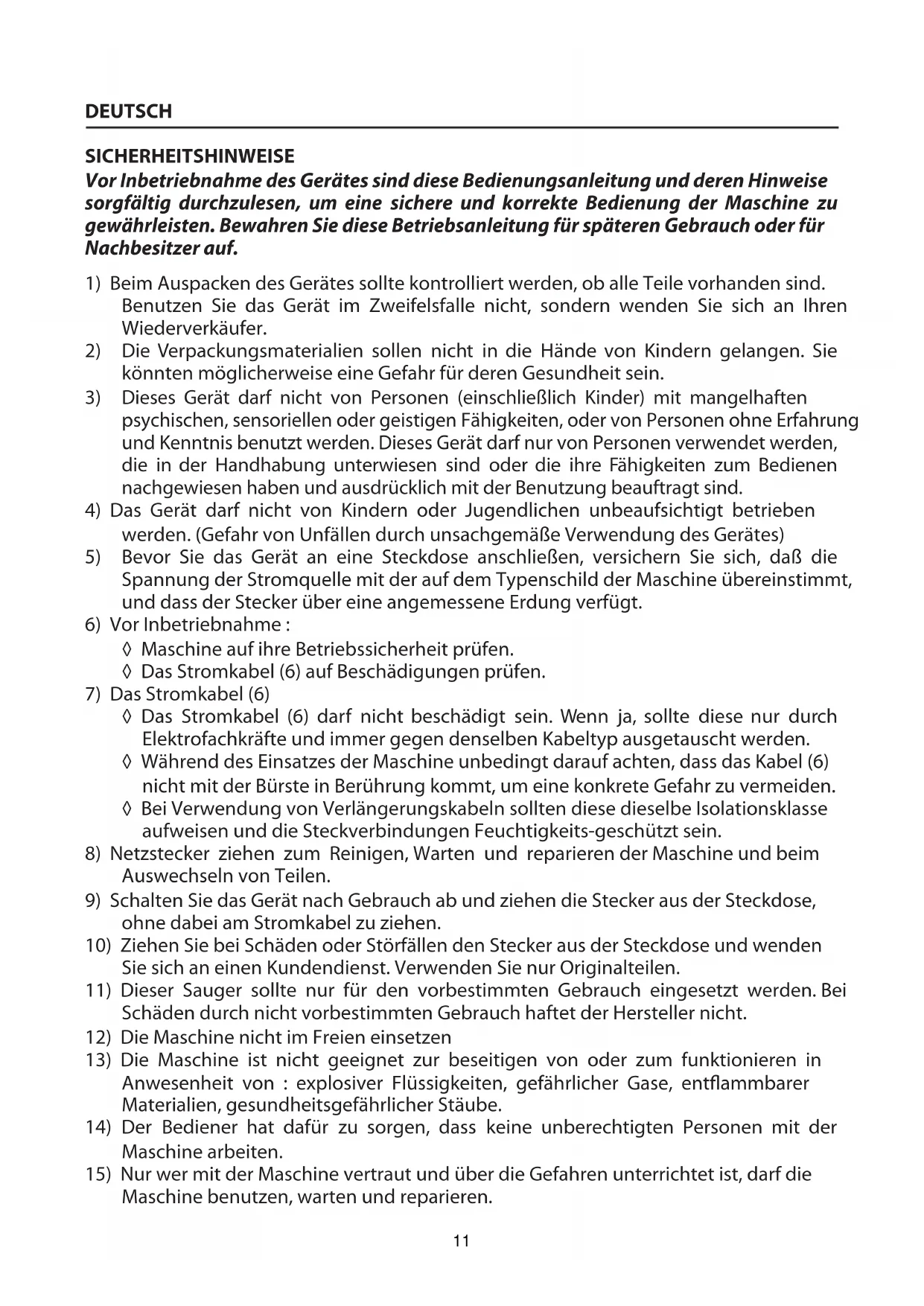 13) Die Maschine ist nicht geeignet zur beseitigen von oder zum Funktionieren in Anwesenheit von : explosiver Flüssigkeiten, gefährlicher Gase, entflammarer Materialien, gesundheitsgeführlicher Stäube.