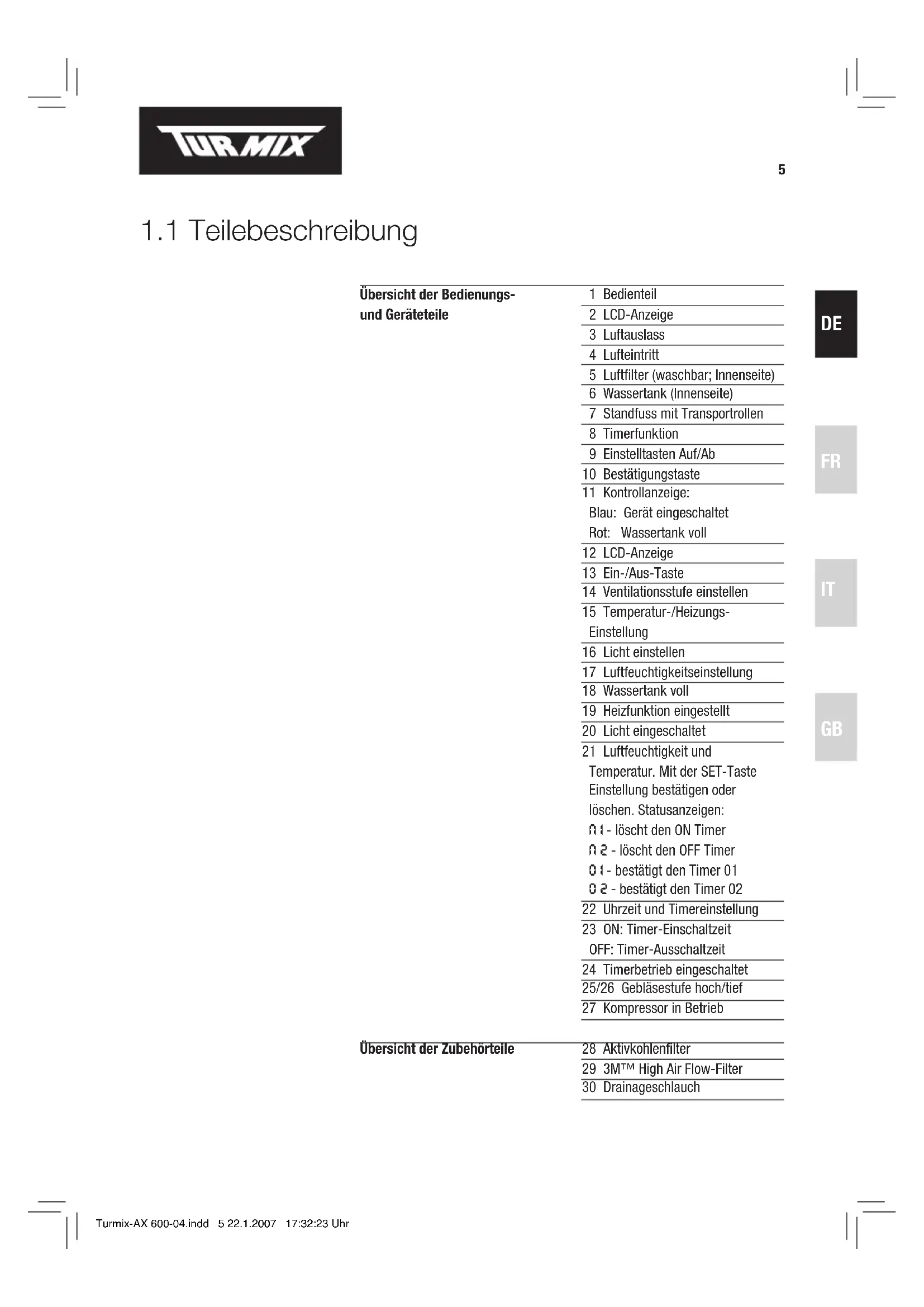 Übersicht der Bedienungs- und Geräteteile Übersicht der Zubehörteile 1 Bedienteil 2 LCD-Anzeige 3 Luftauslass 4 Lufteintritt 5 Luftfilter (waschbar; Innenseite) 6 Wassertank (Innenseite) 7 Standfuss mit Transportrollen 8 Timerfunktion 9 Einstelltasten Auf/Ab 10 Bestätigungstaste 11 Kontrollanzeige: Blau: Gerät eingeschaltet Rot: Wassertank voll 12 LCD-Anzeige 13 Ein-/Aus-Taste 14 Ventilationsstufe einstellen 15 Temperatur-/Heizungs- Einstellung 16 Licht einstellen 17 Luftfeuchtigkeitseinstellung 18 Wassertank voll 19 Heizfunktion eingestellt 20 Licht eingeschaltet 21 Luftfeuchtigkeit und Temperatur. Mit der SET-Taste Einstellung bestätigen oder löschen. Statusanzeigen: N I - löscht den ON Timer N 2 - löscht den OFF Timer O I - bestätigt den Timer 01 O 2 - bestätigt den Timer 02 22 Uhrzeit und Timereinstellung 23 ON: Timer-Einschaltzeit OFF: Timer-Ausschaltzeit 24 Timerbetrieb eingeschaltet 25/26 Gebläsestufe hoch/tief 27 Kompressor in Betrieb 28 Aktivkohlenfilter 29 3M™ High Air Flow-Filter 30 Drainageschlauch Turmix-AX 600-04.indd 5 22.1.2007 17:32:23 Uhr2.