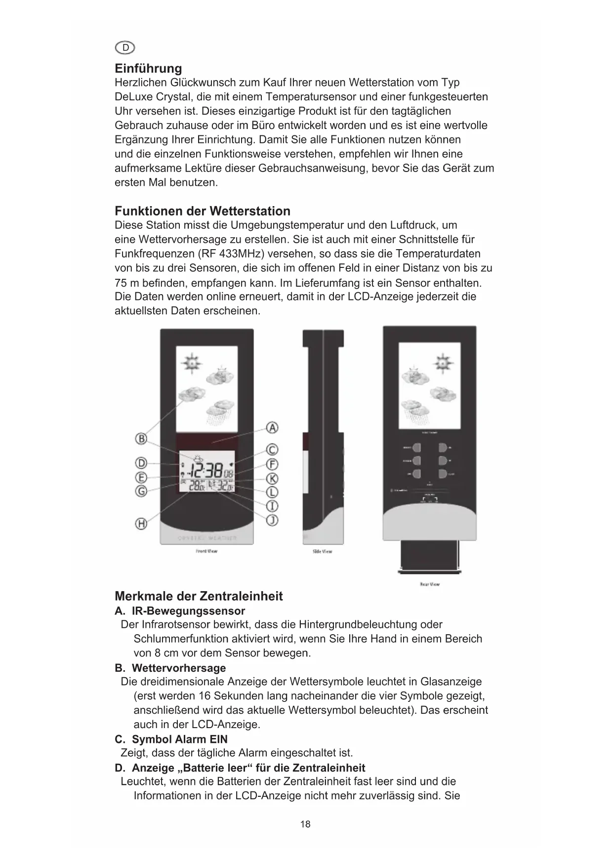 Herzlichen Glückwunsch zum Kauf ihrer neuen Wetterstation vom Typ DeLuxe Crystal, die mit einem Temperatursensor und einer funkgesteuerten Uhr versehen ist. Dieses einzigartige Produkt ist für den tagtäglichen Gebrauch zuhause oder im Büro entwickelt worden und es ist eine wertvolle Ergänzung ihrer Einrichtung. Damit Sie alle Funktionen nutzen können und die einzelnen Funktionswise verstehen, empfehlen wir Ohnen eine aufmerksame Lektüre dieser Gebrauchsanweisung, bevor Sie das Gerät zum ersten Mal benutzen.