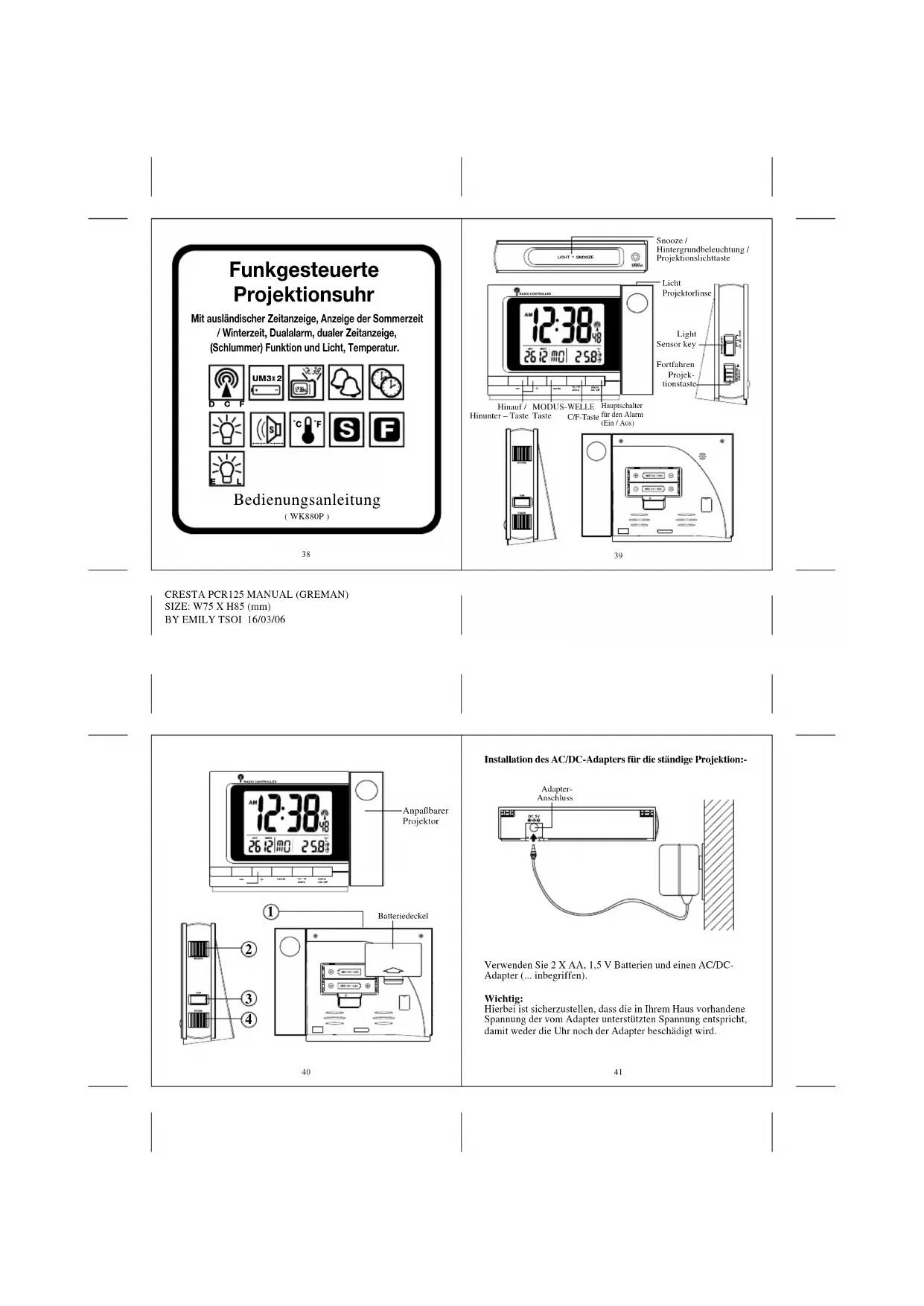 Hierbei ist sichereuzstellen, dass die in ihrem Haus vorhandene Spannung der vom Adapter unterstützen den Spannung entspricht, damit weder die Uhr noch der Adapter beschadigt wird.