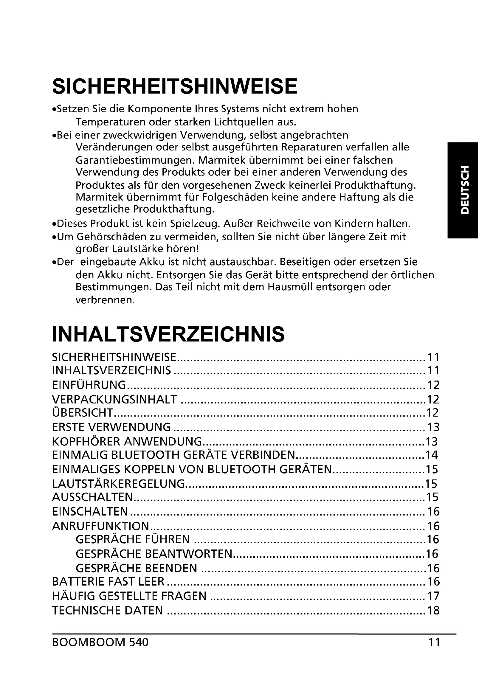 - DEUTSCH SICHERHEITSHINWEISE x Setzen Sie die Komponente Ihres Systems nicht extrem hohen Temperaturen oder starken Lichtquellen aus. x Bei einer zweckwidrigen Verwendung, selbst angebrachten Veränderungen oder selbst ausgeführten Reparaturen verfallen alle Garantiebestimmungen. Marmitek übernimmt bei einer falschen Verwendung des Produkts oder bei einer anderen Verwendung des Produktes als für den vorgesehenen Zweck keinerlei Produkthaftung. Marmitek übernimmt für Folgeschäden keine andere Haftung als die gesetzliche Produkthaftung. x Dieses Produkt ist kein Spielzeug. Außer Reichweite von Kindern halten. x Um Gehörschäden zu vermeiden, sollten Sie nicht über längere Zeit mit großer Lautstärke hören! x Der eingebaute Akku ist nicht austauschbar. Beseitigen oder ersetzen Sie den Akku nicht. Entsorgen Sie das Gerät bitte entsprechend der örtlichen Bestimmungen. Das Teil nicht mit dem Hausmüll entsorgen oder verbrennen. INHALTSVERZEICHNIS SICHERHEITSHINWEISE p. 11
