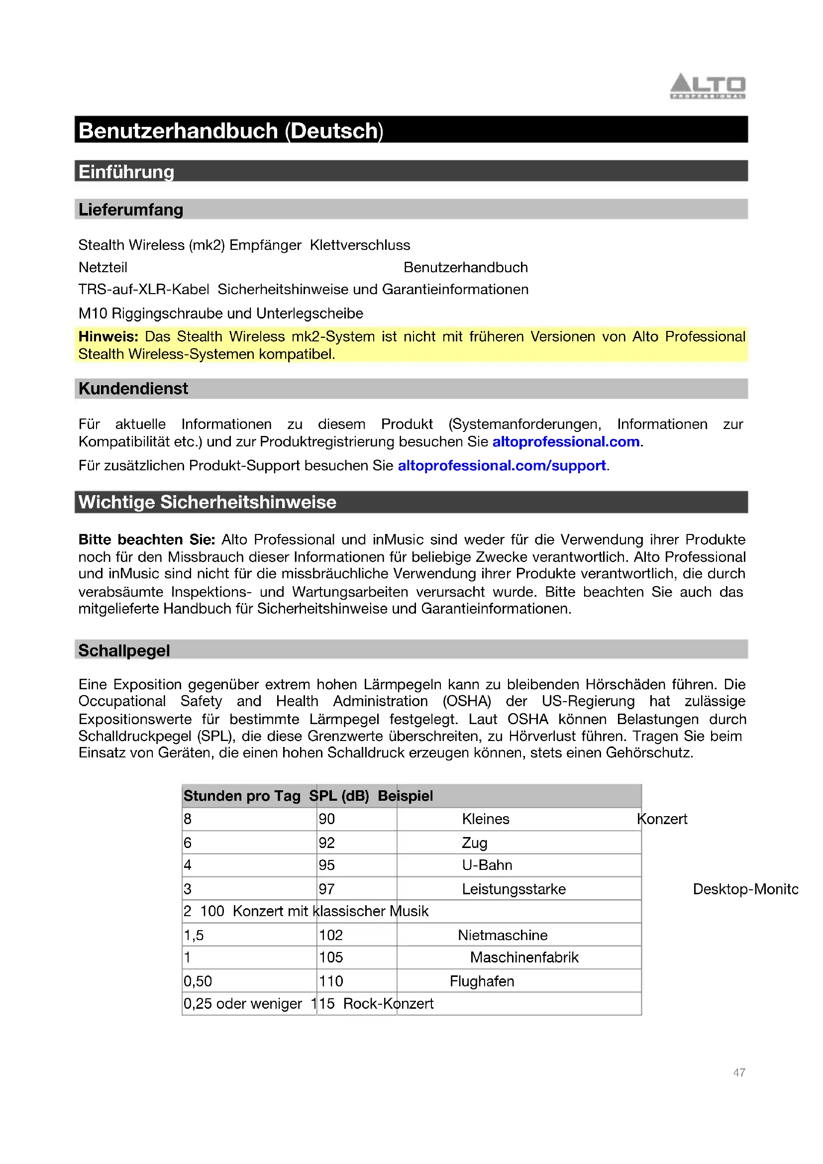 Benutzerhandbuch (Deutsch) Einführung Lieferumfang Stealth Wireless (mk2) Empfänger Klettverschluss Netzteil Benutzerhandbuch TRS-auf-XLR-Kabel Sicherheitshinweise und Garantieinformationen M10 Riggingschraube und Unterlegscheibe Hinweis: Das Stealth Wireless mk2-System ist nicht mit früheren Versionen von Alto Professional Stealth Wireless-Systemen kompatibel. Kundendienst Für aktuelle Informationen zu diesem Produkt (Systemanforderungen, Informationen zur Kompatibilität etc.) und zur Produktregistrierung besuchen Sie altoprofessional.com. Für zusätzlichen Produkt-Support besuchen Sie altoprofessional.com/support. Wichtige Sicherheitshinweise Bitte beachten Sie: Alto Professional und inMusic sind weder für die Verwendung ihrer Produkte noch für den Missbrauch dieser Informationen für beliebige Zwecke verantwortlich. Alto Professional und inMusic sind nicht für die missbräuchliche Verwendung ihrer Produkte verantwortlich, die durch verabsäumte Inspektions- und Wartungsarbeiten verursacht wurde. Bitte beachten Sie auch das mitgelieferte Handbuch für Sicherheitshinweise und Garantieinformationen. Schallpegel Eine Exposition gegenüber extrem hohen Lärmpegeln kann zu bleibenden Hörschäden führen. Die Occupational Safety and Health Administration (OSHA) der US-Regierung hat zulässige Expositionswerte für bestimmte Lärmpegel festgelegt. Laut OSHA können Belastungen durch Schalldruckpegel (SPL), die diese Grenzwerte überschreiten, zu Hörverlust führen. Tragen Sie beim Einsatz von Geräten, die einen hohen Schalldruck erzeugen können, stets einen Gehörschutz. Stunden pro Tag SPL (dB) Beispiel 8 90 Kleines Konzert 6 92 Zug 4 95 U-Bahn 3 97 Leistungsstarke Desktop-Monitore 2 100 Konzert mit klassischer Musik 1,5 102 Nietmaschine 1 105 Maschinenfabrik 0,50 110 Flughafen 0,25 oder weniger 115 Rock-Konzert48