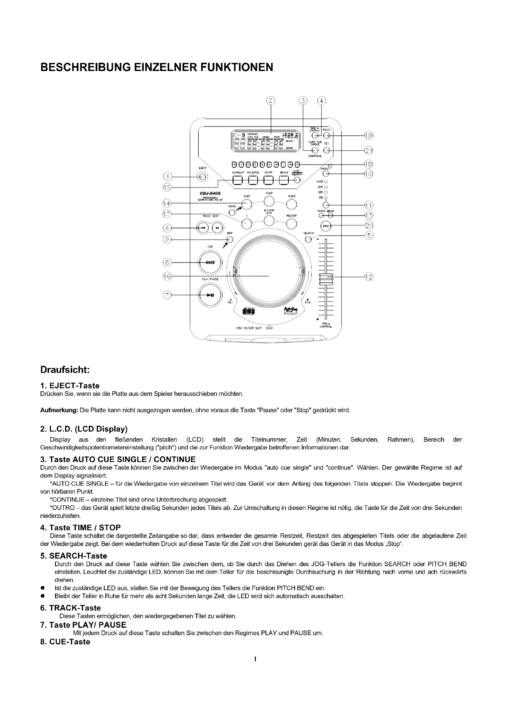 *AUTO CUE SINGLE – für die Wiedergabe von einzelnem Titel wird das Gerät vor dem Anfang des folgenden Titels stoppen. Die Wiedergabe beginnt von hörbaren Punkt.