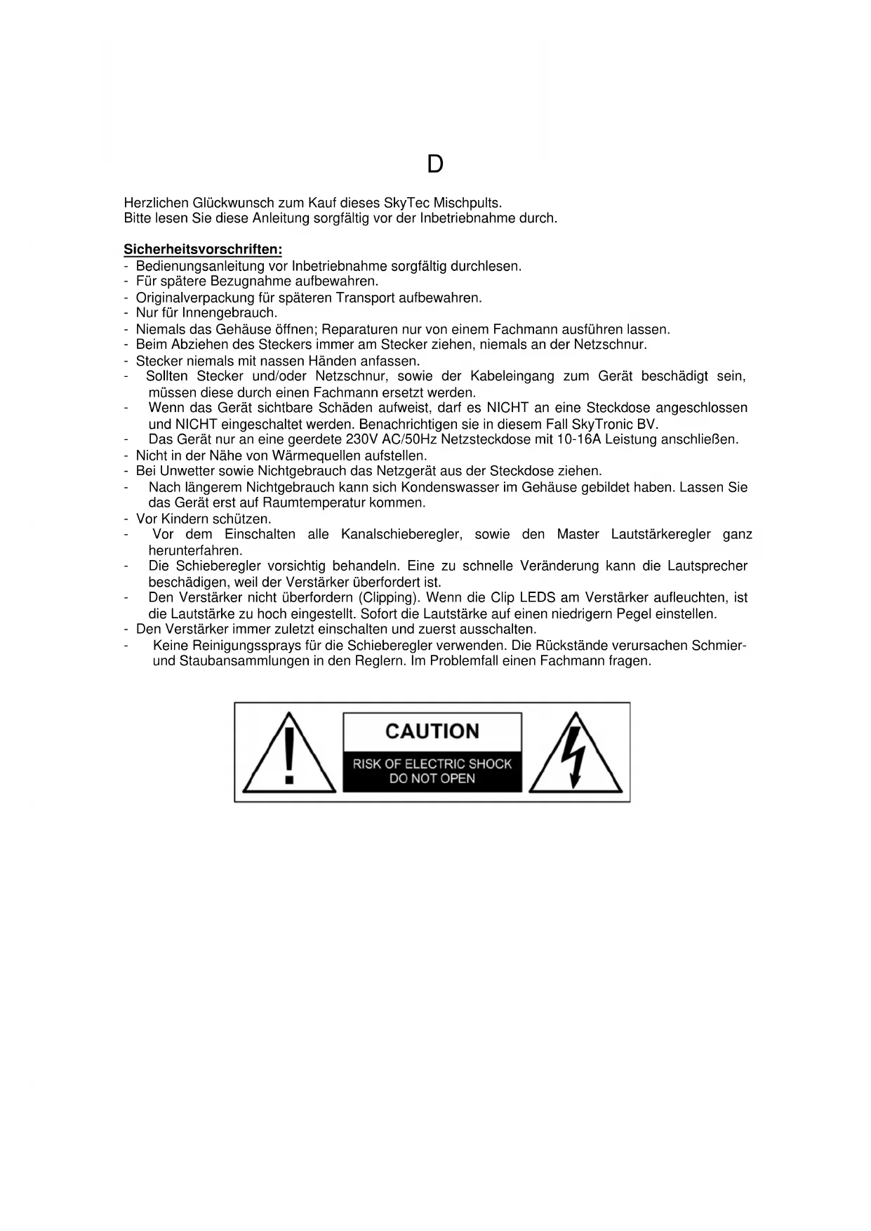 - Wenn das Gerät sightbare Schäden aufweist, dart es NICT an eine Steckdose angeschlossen und NICT eingeschaltet werden. Benachrichtigen sie in thisem Fall SkyTronic BV.