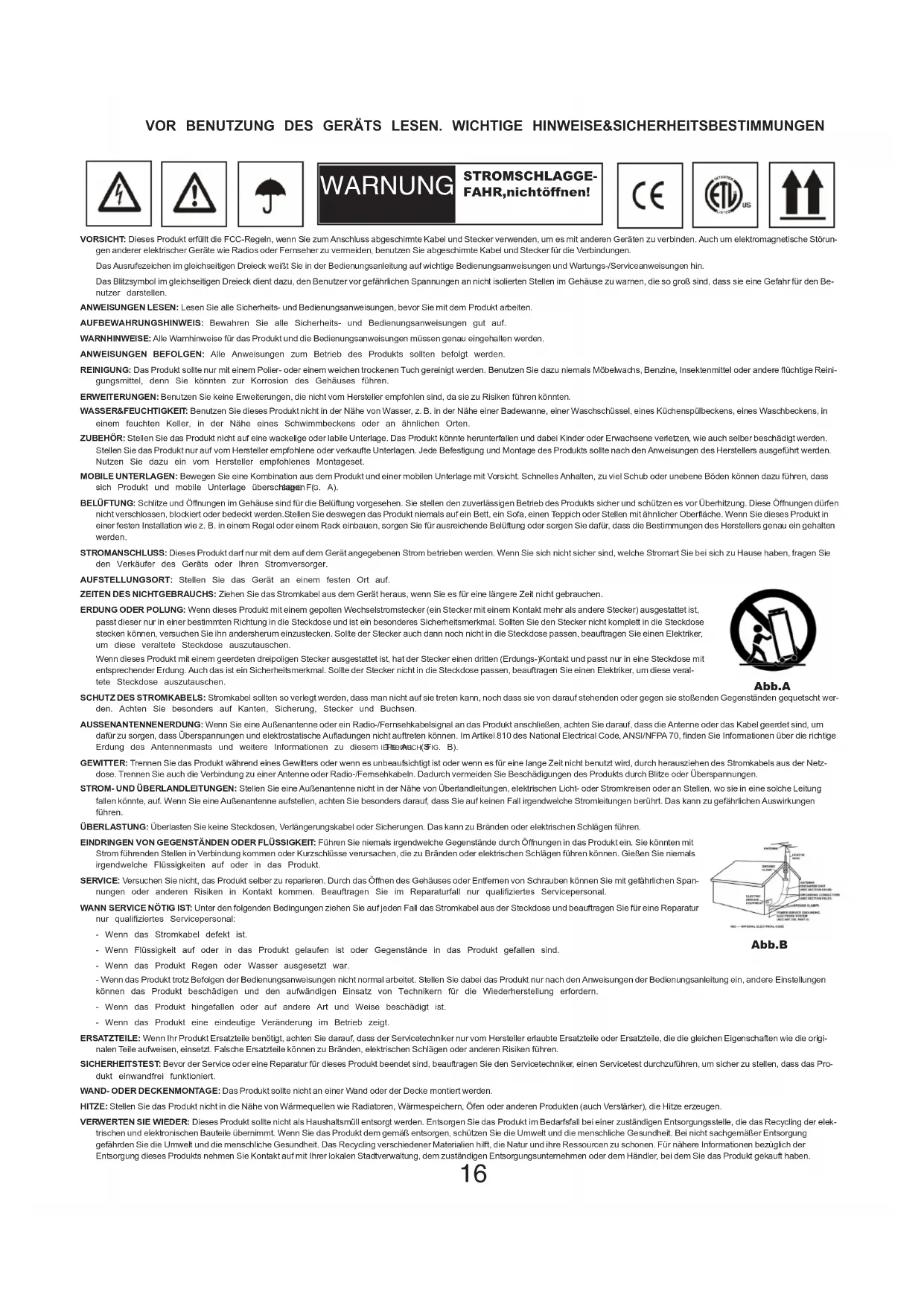 29VORSICHT: Dieses Produkt erfüllt die FCC-Regeln, wenn Sie zum Anschluss abgeschirmte Kabel und Stecker verwenden, um es mit anderen Geräten zu verbinden. Auch um elektromagnetische Störun- gen anderer elektrischer Geräte wie Radios oder Fernseher zu vermeiden, benutzen Sie abgeschirmte Kabel und Stecker für die Verbindungen. Das Ausrufezeichen im gleichseitigen Dreieck weißt Sie in der Bedienungsanleitung auf wichtige Bedienungsanweisungen und Wartungs-/Serviceanweisungen hin. Das Blitzsymbol im gleichseitigen Dreieck dient dazu, den Benutzer vor gefährlichen Spannungen an nicht isolierten Stellen im Gehäuse zu warnen, die so groß sind, dass sie eine Gefahr für den Be- nutzer darstellen. ANWEISUNGEN LESEN: Lesen Sie alle Sicherheits- und Bedienungsanweisungen, bevor Sie mit dem Produkt arbeiten. AUFBEWAHRUNGSHINWEIS: Bewahren Sie alle Sicherheits- und Bedienungsanweisungen gut auf. WARNHINWEISE: Alle Warnhinweise für das Produkt und die Bedienungsanweisungen müssen genau eingehalten werden. ANWEISUNGEN BEFOLGEN: Alle Anweisungen zum Betrieb des Produkts sollten befolgt werden. REINIGUNG: Das Produkt sollte nur mit einem Polier- oder einem weichen trockenen Tuch gereinigt werden. Benutzen Sie dazu niemals Möbelwachs, Benzine, Insektenmittel oder andere flüchtige Reini- gungsmittel, denn Sie könnten zur Korrosion des Gehäuses führen. ERWEITERUNGEN: Benutzen Sie keine Erweiterungen, die nicht vom Hersteller empfohlen sind, da sie zu Risiken führen könnten. WASSER&FEUCHTIGKEIT: Benutzen Sie dieses Produkt nicht in der Nähe von Wasser, z. B. in der Nähe einer Badewanne, einer Waschschüssel, eines Küchenspülbeckens, eines Waschbeckens, in einem feuchten Keller, in der Nähe eines Schwimmbeckens oder an ähnlichen Orten. ZUBEHÖR: Stellen Sie das Produkt nicht auf eine wackelige oder labile Unterlage. Das Produkt könnte herunterfallen und dabei Kinder oder Erwachsene verletzen, wie auch selber beschädigt werden. Stellen Sie das Produkt nur auf vom Hersteller empfohlene oder verkaufte Unterlagen. Jede Befestigung und Montage des Produkts sollte nach den Anweisungen des Herstellers ausgeführt werden. Nutzen Sie dazu ein vom Hersteller empfohlenes Montageset. MOBILE UNTERLAGEN: Bewegen Sie eine Kombination aus dem Produkt und einer mobilen Unterlage mit Vorsicht. Schnelles Anhalten, zu viel Schub oder unebene Böden können dazu führen, dass sich Produkt und mobile Unterlage überschlagen ( SIEHE FIG. A). BELÜFTUNG: Schlitze und Öffnungen im Gehäuse sind für die Belüftung vorgesehen. Sie stellen den zuverlässigen Betrieb des Produkts sicher und schützen es vor Überhitzung. Diese Öffnungen dürfen nicht verschlossen, blockiert oder bedeckt werden.Stellen Sie deswegen das Produkt niemals auf ein Bett, ein Sofa, einen Teppich oder Stellen mit ähnlicher Oberfläche. Wenn Sie dieses Produkt in einer festen Installation wie z. B. in einem Regal oder einem Rack einbauen, sorgen Sie für ausreichende Belüftung oder sorgen Sie dafür, dass die Bestimmungen des Herstellers genau ein gehalten werden. STROMANSCHLUSS: Dieses Produkt darf nur mit dem auf dem Gerät angegebenen Strom betrieben werden. Wenn Sie sich nicht sicher sind, welche Stromart Sie bei sich zu Hause haben, fragen Sie den Verkäufer des Geräts oder Ihren Stromversorger. AUFSTELLUNGSORT: Stellen Sie das Gerät an einem festen Ort auf. ZEITEN DES NICHTGEBRAUCHS: Ziehen Sie das Stromkabel aus dem Gerät heraus, wenn Sie es für eine längere Zeit nicht gebrauchen. ERDUNG ODER POLUNG: Wenn dieses Produkt mit einem gepolten Wechselstromstecker (ein Stecker mit einem Kontakt mehr als andere Stecker) ausgestattet ist, passt dieser nur in einer bestimmten Richtung in die Steckdose und ist ein besonderes Sicherheitsmerkmal. Sollten Sie den Stecker nicht komplett in die Steckdose stecken können, versuchen Sie ihn andersherum einzustecken. Sollte der Stecker auch dann noch nicht in die Steckdose passen, beauftragen Sie einen Elektriker, um diese veraltete Steckdose auszutauschen. Wenn dieses Produkt mit einem geerdeten dreipoligen Stecker ausgestattet ist, hat der Stecker einen dritten (Erdungs-)Kontakt und passt nur in eine Steckdose mit entsprechender Erdung. Auch das ist ein Sicherheitsmerkmal. Sollte der Stecker nicht in die Steckdose passen, beauftragen Sie einen Elektriker, um diese veral- tete Steckdose auszutauschen. SCHUTZ DES STROMKABELS: Stromkabel sollten so verlegt werden, dass man nicht auf sie treten kann, noch dass sie von darauf stehenden oder gegen sie stoßenden Gegenständen gequetscht wer- den. Achten Sie besonders auf Kanten, Sicherung, Stecker und Buchsen. AUSSENANTENNENERDUNG: Wenn Sie eine Außenantenne oder ein Radio-/Fernsehkabelsignal an das Produkt anschließen, achten Sie darauf, dass die Antenne oder das Kabel geerdet sind, um dafür zu sorgen, dass Überspannungen und elektrostatische Aufladungen nicht auftreten können. Im Artikel 810 des National Electrical Code, ANSI/NFPA 70, finden Sie Informationen über die richtige Erdung des Antennenmasts und weitere Informationen zu diesem Thema. (S IEHE AUCH FIG. B). GEWITTER: Trennen Sie das Produkt während eines Gewitters oder wenn es unbeaufsichtigt ist oder wenn es für eine lange Zeit nicht benutzt wird, durch herausziehen des Stromkabels aus der Netz- dose. Trennen Sie auch die Verbindung zu einer Antenne oder Radio-/Fernsehkabeln. Dadurch vermeiden Sie Beschädigungen des Produkts durch Blitze oder Überspannungen. STROM- UND ÜBERLANDLEITUNGEN: Stellen Sie eine Außenantenne nicht in der Nähe von Überlandleitungen, elektrischen Licht- oder Stromkreisen oder an Stellen, wo sie in eine solche Leitung fallen könnte, auf. Wenn Sie eine Außenantenne aufstellen, achten Sie besonders darauf, dass Sie auf keinen Fall irgendwelche Stromleitungen berührt. Das kann zu gefährlichen Auswirkungen führen. ÜBERLASTUNG: Überlasten Sie keine Steckdosen, Verlängerungskabel oder Sicherungen. Das kann zu Bränden oder elektrischen Schlä