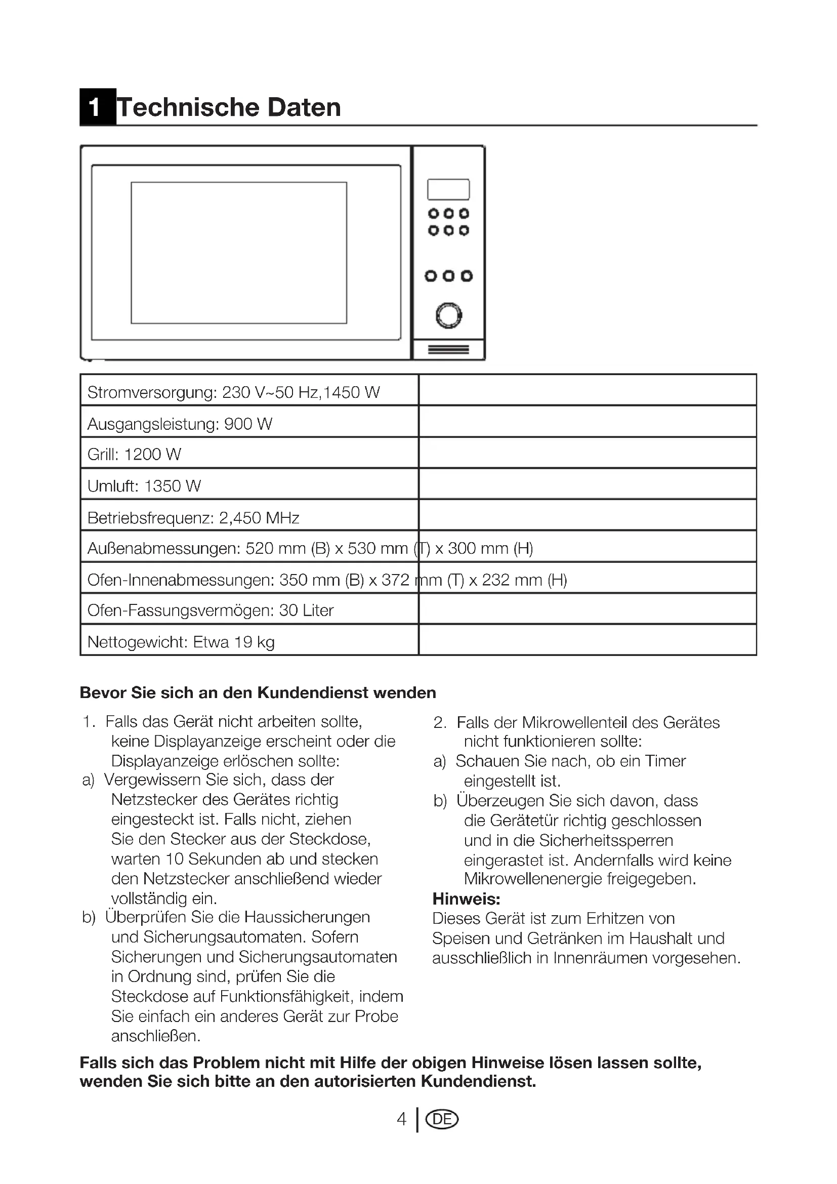 Stromversorgung: 230 V~50 Hz,1450 W Ausgangsleistung: 900 W Grill: 1200 W Umluft: 1350 W Betriebsfrequenz: 2,450 MHz Außenabmessungen: 520 mm (B) x 530 mm (T) x 300 mm (H) Ofen-Innenabmessungen: 350 mm (B) x 372 mm (T) x 232 mm (H) Ofen-Fassungsvermögen: 30 Liter Nettogewicht: Etwa 19 kg 1 Technische Daten