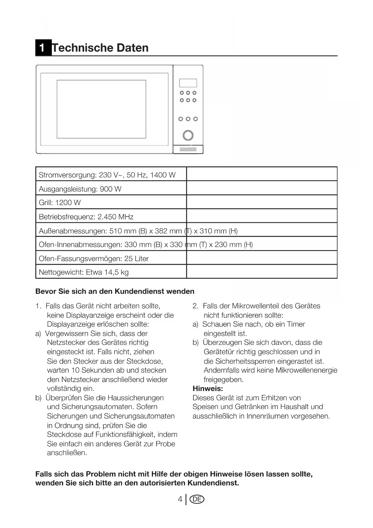 Stromversorgung: 230 V~, 50 Hz, 1400 W Ausgangsleistung: 900 W Grill: 1200 W Betriebsfrequenz: 2.450 MHz Außenabmessungen: 510 mm (B) x 382 mm (T) x 310 mm (H) Ofen-Innenabmessungen: 330 mm (B) x 330 mm (T) x 230 mm (H) Ofen-Fassungsvermögen: 25 Liter Nettogewicht: Etwa 14,5 kg 1 Technische Daten