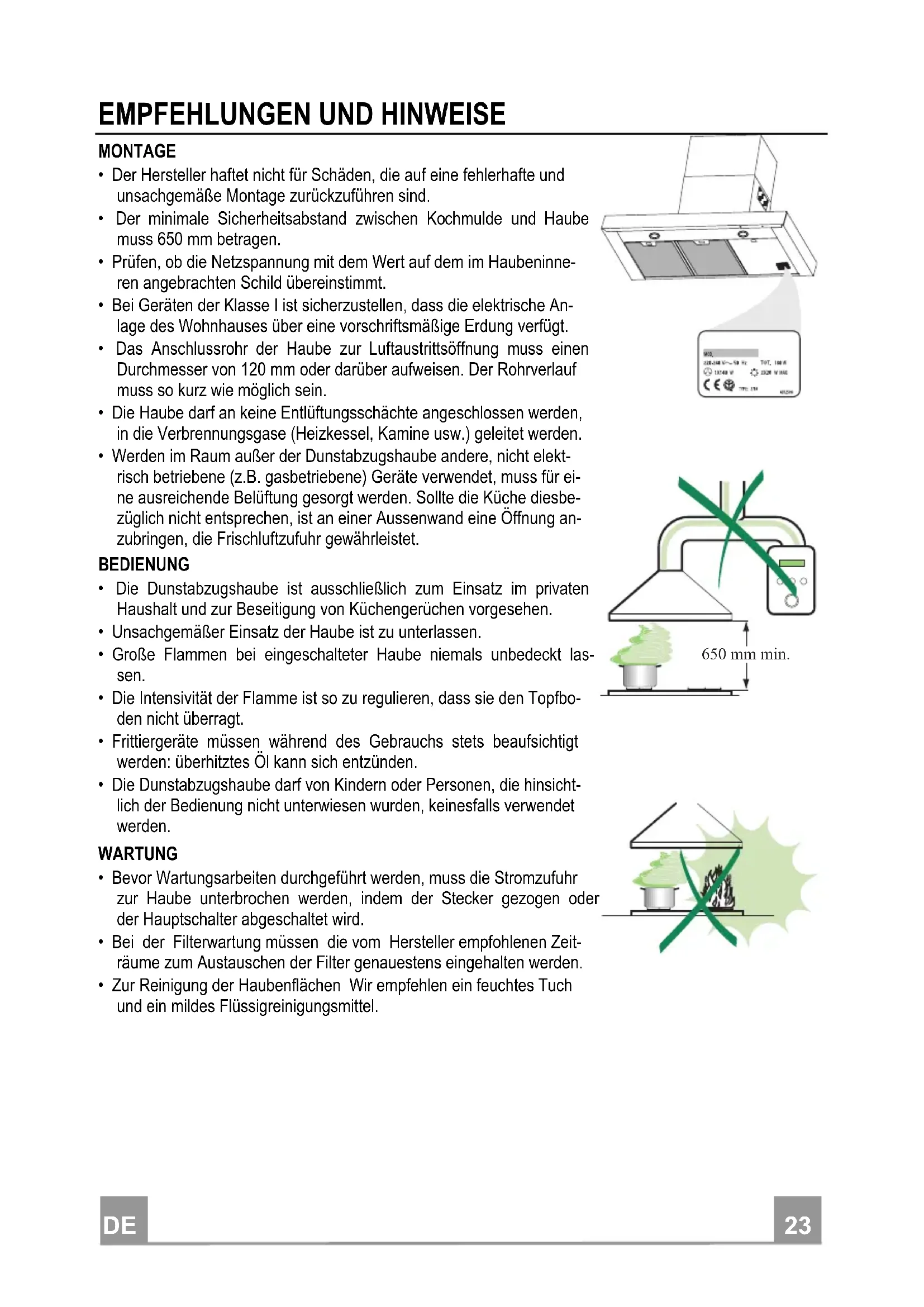 - Zur Reinigung der Haubenflächen Wir empfehlen ein feuchtes Tuch und ein mildes Flüssigreinigungsmittel. 650 mm min.DE