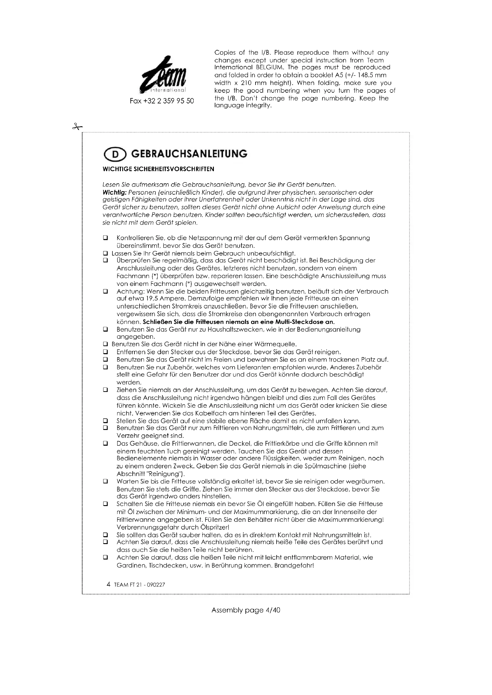 FT 21 - Fritteuse TEAM - Kostenlose Bedienungsanleitung