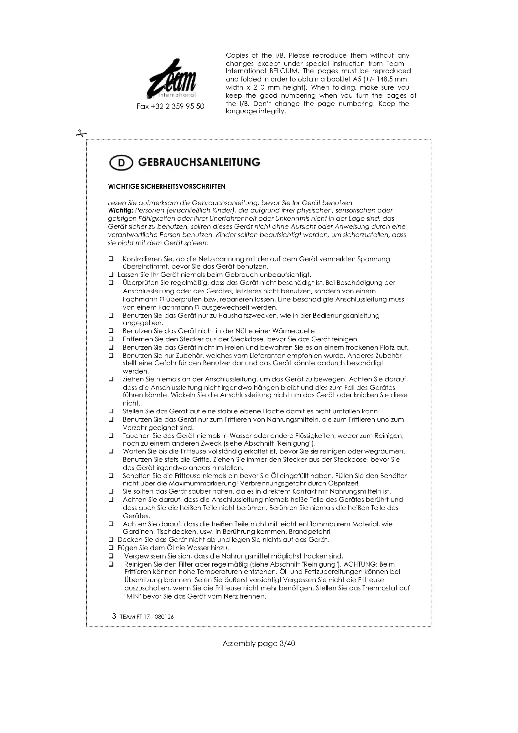 FT 17 - Fritteuse TEAM - Kostenlose Bedienungsanleitung