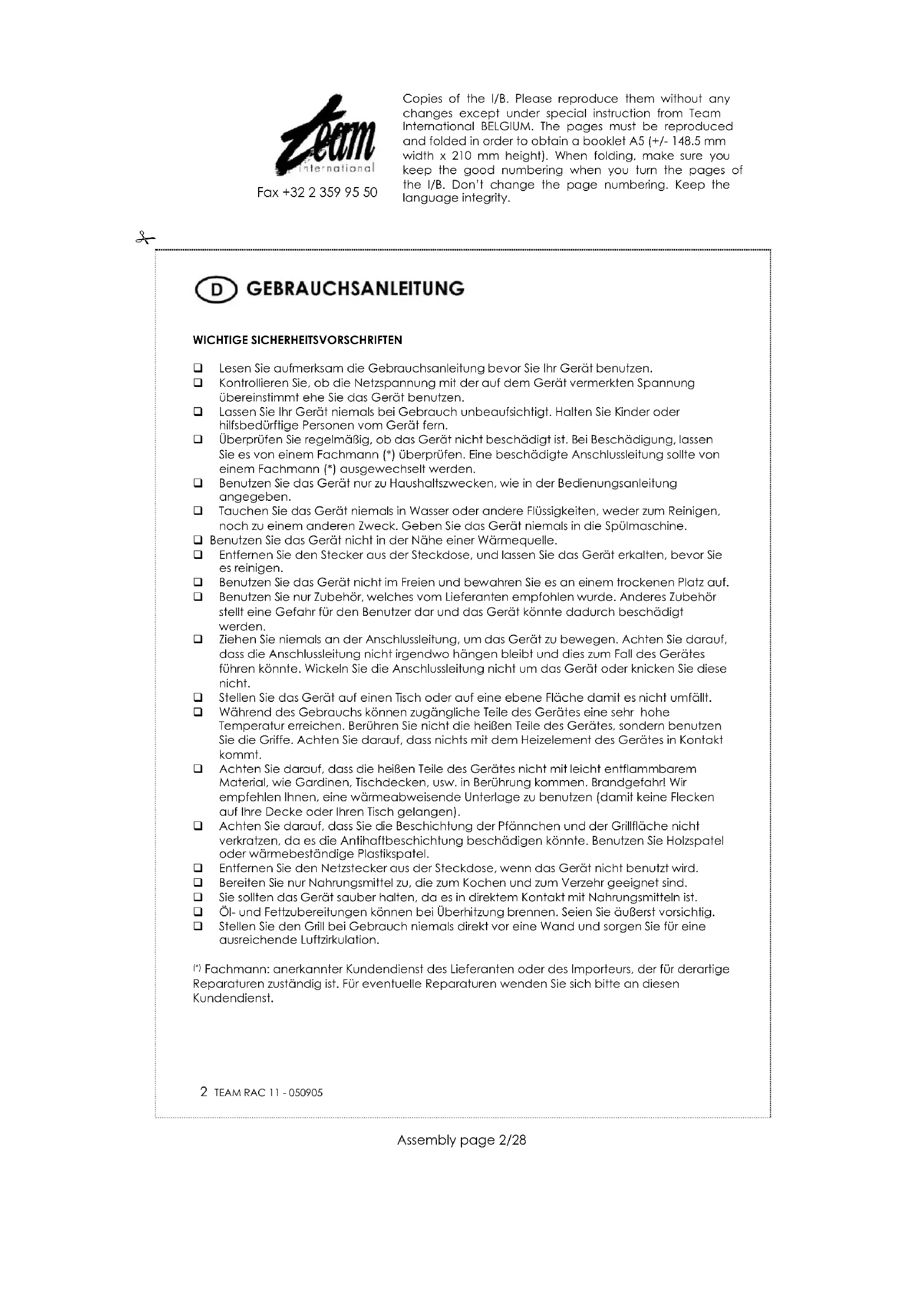 Fax +32 2 359 95 50 GEBRAUCHSANWEISUNG Vor dem ersten Gebrauch sollten Sie die Grillplatte und die Pfännchen mit einem feuchten Tuch reinigen und leicht einölen. Beim ersten Gebrauch können Rauch und Gerüche wahrgenommen werden, welche durch das Verbrennen von Schutzfetten entstehen. Das Gerät sollte deshalb etwa 10 Minuten ohne Nahrungsmittel aufgeheizt werden (den Raum während dieses Vorganges lüften). Zum Aufheizen vor der eigentlichen Verwendung schalten Sie bitte stets den Grill ein und heizen Sie ihn ca. 10 Minuten auf. Um Ihre Tischdecke vor Fettspritzern zu schützen, legen Sie ein leicht zu reinigendes Tischtuch unter das Gerät. Nachdem Sie die Sicherheitshinweise aufmerksam gelesen haben, stecken Sie den Stecker in eine Schukosteckdose und betätigen Sie den Ein-/Ausschalter. Die Kontrollleuchte wird angehen, um anzudeuten, dass das Gerät in Betrieb ist. Wenn Sie eine Verlängerungsschnur benutzen, vergewissern Sie sich, dass deren Eigenschaften den Eigenschaften des Gerätes (siehe Typenschild) entsprechen. Hinweis: Wenn das Gerät vorwärmt, und die Pfännchen sauber sind, können Sie diese schon auf das Gerät legen um sie aufzuwärmen, aber lassen Sie nie ein schon verwendetes Pfännchen auf dem Heizelement des Gerätes, da die Reste der Nahrungsmittel brennen könnten. GRILL Stellen Sie den Raclette-Grill in die Mitte der Tischrunde. Schneiden Sie das Fleisch in mundgerechte Happen. Diese werden schneller gar. Servieren Sie das so vorbereitete Fleisch auf einer Platte oder auf einem Holzbrett. Jeder Esser nimmt sich dann eine entsprechende Menge auf seinen Teller und grillt seine Stücke selbst auf der Grillplatte. In den Pfännchen können Sie toasten, Früchte garen, überbacken, Spiegeleier braten, Bratkartoffeln zubereiten und vieles andere mehr. Als Beilagen servieren Sie Saucen und Salate sowie französisches Stangen-Weißbrot. Die flache Einbuchtung des Grills ist die Pfannkuchenfläche, die für die Zubereitung von Pfannkuchen und Omelette oder Spiegeleier vorgesehen ist. RACLETTE Das Grillen von Käse ist eine Schweizer Spezialität. Rechnen Sie pro Person mit 150 bis 250 Gramm Käse, den Sie in Scheiben von ca. 2 mm schneiden. Bereiten Sie Kartoffeln mit Schale vor, welche Sie entweder in einem geschlossenen Topf oder auf der Grillfläche warm halten. Geben Sie ein Stück Käse in die Pfännchen und schieben Sie diese in das Gerät. Der Käse beginnt nach ca. 3-4 Minuten an zu schmelzen. Sobald der Käse eine goldgelbe Tönung angenommen hat, ist er fertig zum Verzehr und kann aus dem Pfännchen auf den Teller oder über die Kartoffeln gegeben werden. Würzen Sie den Käse mit frisch gemahlenem Pfeffer. Zum Raclette serviert man rohen Schinken, Bündnerfleisch, kleine Zwiebeln und Gurken, sowie trockenen Wein. Schalten Sie das Gerät nach dem Gebrauch aus. Copies of the I/B. Please reproduce them without any changes except under special instruction from Team International BELGIUM. The pages must be reproduced and folded in order to obtain a booklet A5 (+/- 148.5 mm width x 210 mm height). When folding, make sure you keep the good numbering when you turn the pages of the I/B. Don’t change the page numbering. Keep the language integrity.