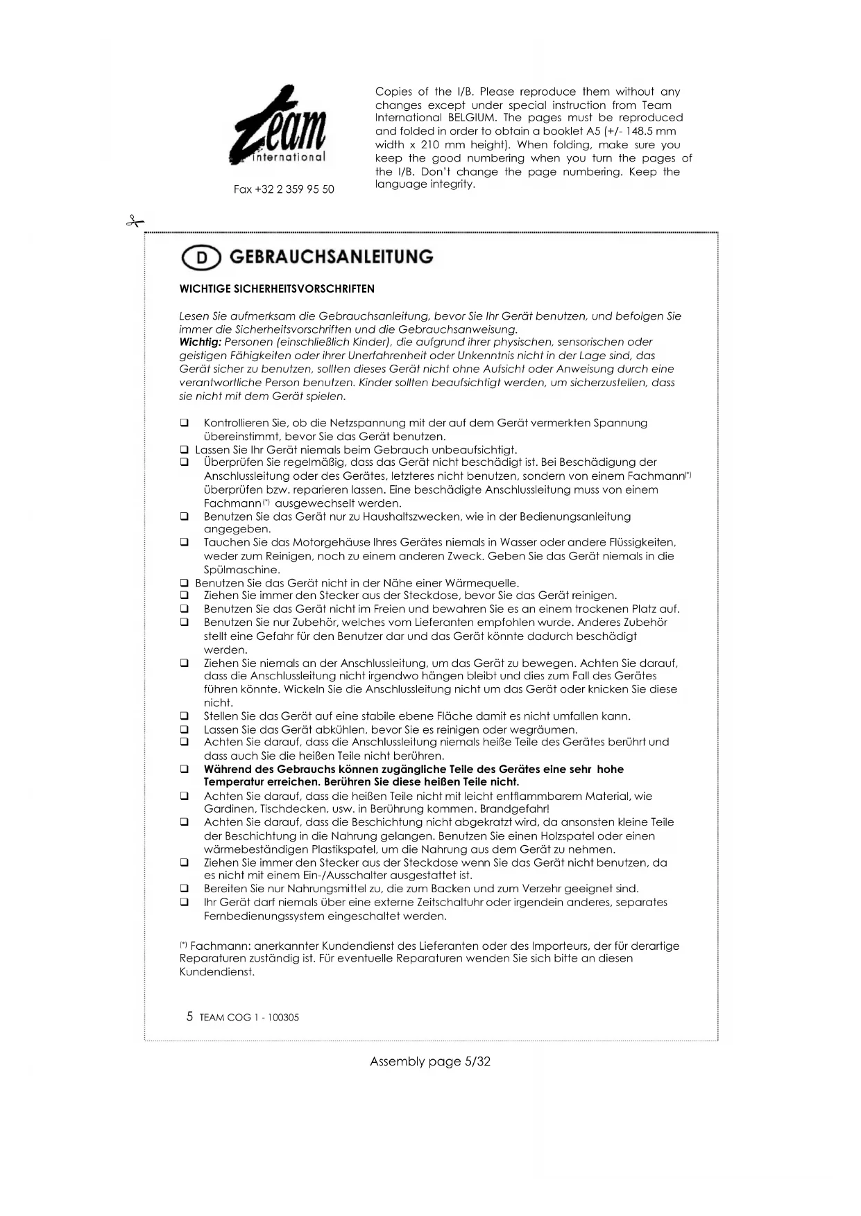 Zum Schutz unserer Umwelt und unserer Gesundheit sind Elektro- und Elektronik-Altgeräte nach bestimmten Regeln zu entsorgen. Dies fordert den Einsatz sowohl des Herstellers bzw. Lieferanten als auch des Verbrauchers. Aus diesem Grund darf dieses Gerät, wie das Symbol auf dem Typenschild bzw. auf der Verpackung zeigt, nicht in den unsortierten Restmüll gegeben werden. Der Verbraucher hat das Recht, dieses Gerät über kommunale Sammelstellen zu entsorgen; von dort aus wird die spezifische Behandlung, Verwertung bzw. das Recycling gem. den Erfordernissen der Richtlinie sichergestellt. Copies of the I/B. Please reproduce them without any changes except under special instruction from Team International BELGIUM. The pages must be reproduced and folded in order to obtain a booklet A5 (+/- 148.5 mm width x 210 mm height). When folding, make sure you keep the good numbering when you turn the pages of the I/B. Don’t change the page numbering. Keep the language integrity.