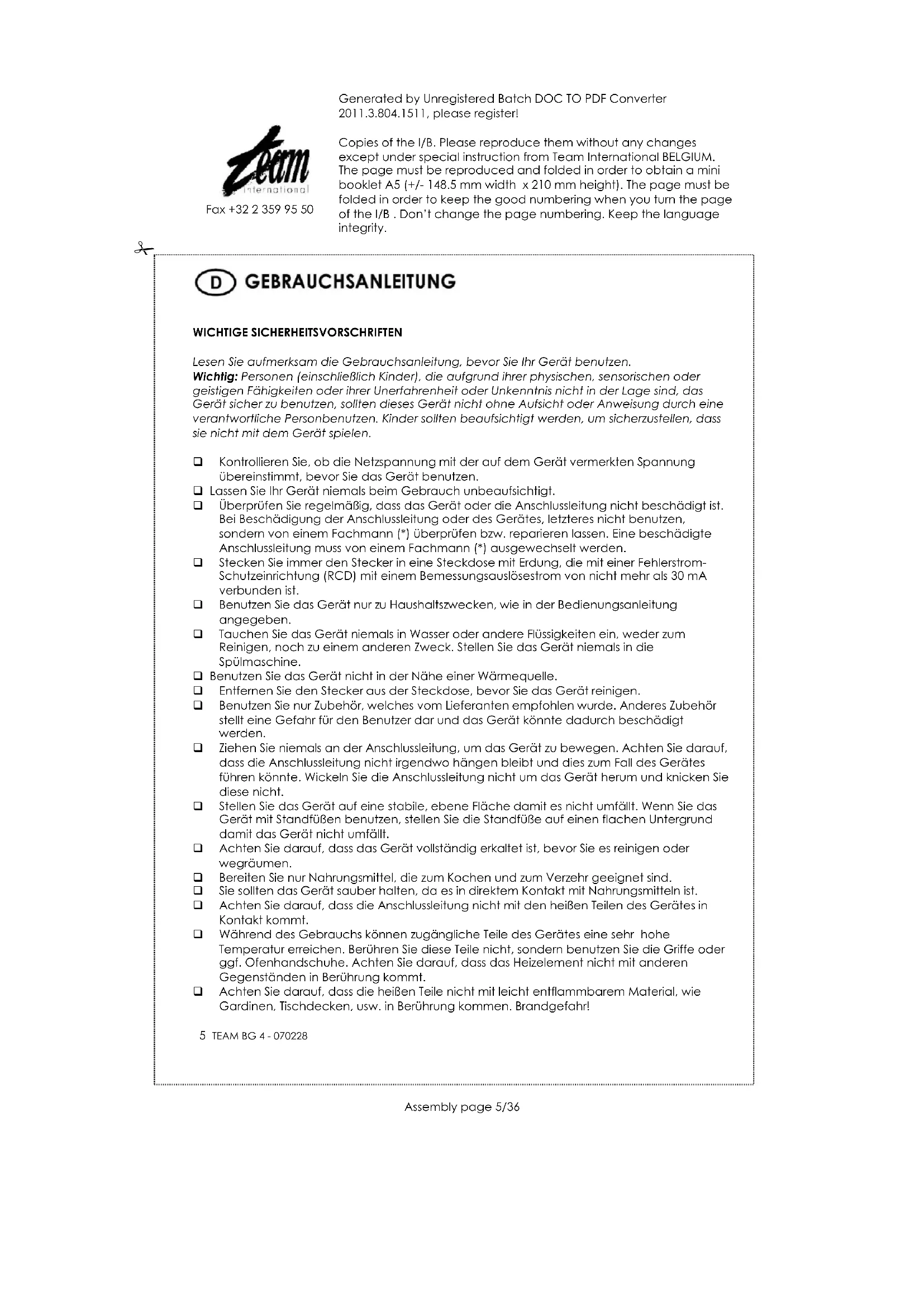 Zum Schutz unserer Umwelt und unserer Gesundheit sind Elektro- und Elektronik-Altgeräte nach bestimmten Regeln zu entsorgen. Dies fordert den Einsatz sowohl des Herstellers bzw. Lieferanten als auch des Verbrauchers. Aus diesem Grund darf dieses Gerät, wie das Symbol auf dem Typenschild bzw. auf der Verpackung zeigt, nicht in den unsortierten Restmüll gegeben werden. Der Verbraucher hat das Recht, dieses Gerät über kommunale Sammelstellen zu entsorgen; von dort aus wird die spezifische Behandlung, Verwertung bzw. das Recycling gem. den Erfordernissen der Richtlinie sichergestellt.Generated by Unregistered Batch DOC TO PDF Converter 2011.3.804.1511, please register! Copies of the I/B. Please reproduce them without any changes except under special instruction from Team International BELGIUM. The page must be reproduced and folded in order to obtain a mini booklet A5 (+/- 148.5 mm width x 210 mm height). The page must be folded in order to keep the good numbering when you turn the page of the I/B . Don’t change the page numbering. Keep the language integrity.