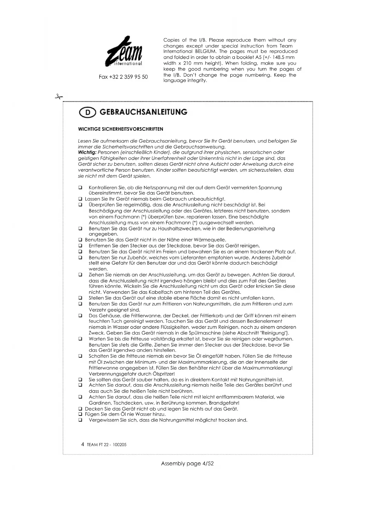 Tupfen Sie die zu frittierende Nahrung ab bevor Sie diese in die Fritteuse geben. Bei “nasser” Nahrung spritzt das Öl und kann es überkochen. Achten Sie darauf, dass die Nahrungsstücke möglichst die gleiche Größe haben, so dass sie gleichmäßig frittiert werden. Bestimmte Nahrung wird paniert oder in Teig gerollt. Warten Sie immer bis die Fritteuse die gewünschte Temperatur erreicht hat und die Kontrollleuchte erlischt, bevor Sie Nahrung in die Fritteuse geben. Achten Sie darauf, dass Sie den Frittierkorb nicht zu sehr füllen. ACHTUNG: Ihre Fritteuse ist mit einem Sicherheitssystem ausgestattet, das das Gerät ausschaltet, falls es überhitzt (z.B. wegen eines Fehlbetriebes des Thermostats). Schalten Sie das Gerät in diesem Fall sofort aus und ziehen Sie den Stecker aus der Steckdose. Die Fritteuse sollte vollkommen abgekühlt sein (etwa 15 Minuten), ehe Sie den “RESTART-Knopf”, der sich am hinteren Teil des Gerätes, über dem Kabelfach befindet, mithilfe eines spitzen Gegenstandes drücken. Die Fritteuse kann erneut benutzt werden. Lesen Sie sorgfältig die Gebrauchsanleitung, damit dieses Problem nicht mehr auftritt. Copies of the I/B. Please reproduce them without any changes except under special instruction from Team International BELGIUM. The pages must be reproduced and folded in order to obtain a booklet A5 (+/- 148.5 mm width x 210 mm height). When folding, make sure you keep the good numbering when you turn the pages of the I/B. Don‟t change the page numbering. Keep the language integrity.