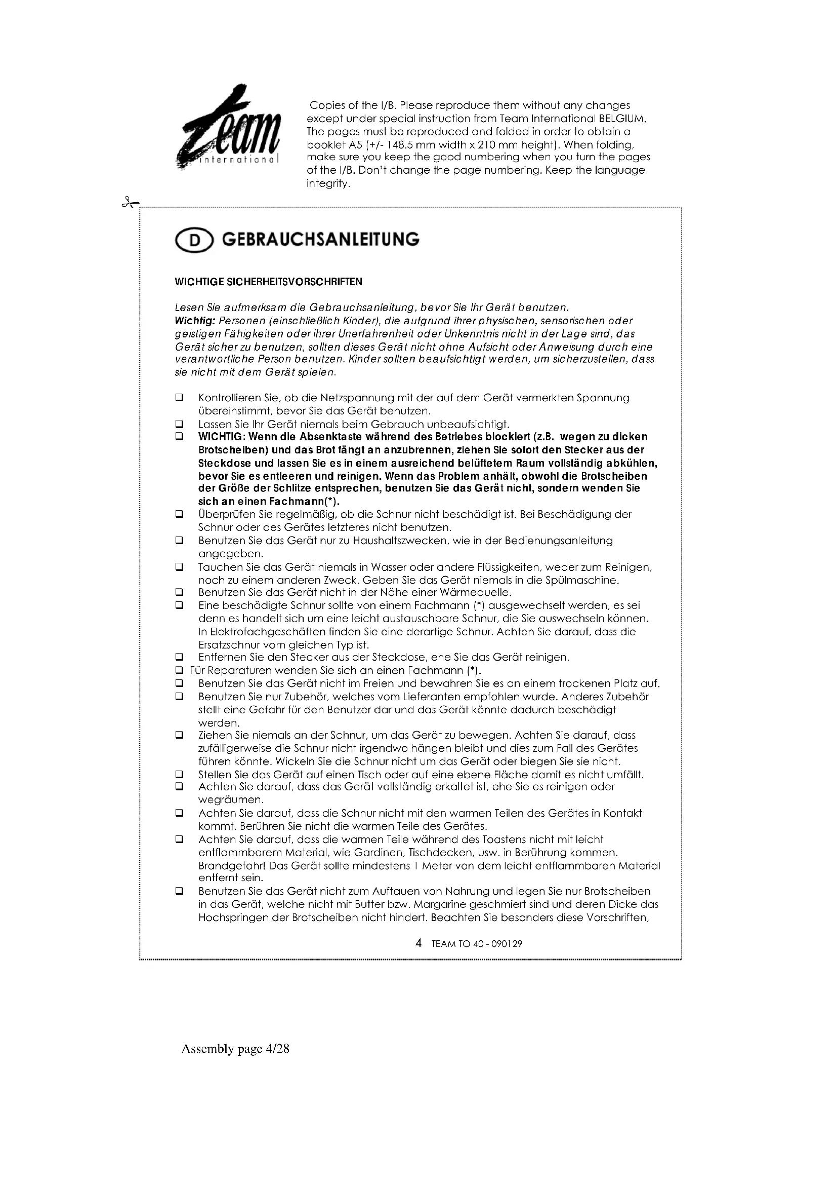 WICHTIGE SICHERHEITSVORSCHRIFTEN Lesen Sie aufmerksam die Gebrauchsanleitung, bevor Sie Ihr Gerät benutzen. Wichtig: Personen (einschließlich Kinder), die aufgrund ihrer physischen, sensorischen oder geistigen Fähigkeiten oder ihrer Unerfahrenheit oder Unkenntnis nicht in der Lage sind, das Gerät sicher zu benutzen, sollten dieses Gerät nicht ohne Aufsicht oder Anweisung durch eine verantwortliche Person benutzen. Kinder sollten beaufsichtigt werden, um sicherzustellen, dass sie nicht mit dem Gerät spielen. Kontrollieren Sie, ob die Netzspannung mit der auf dem Gerät vermerkten Spannung übereinstimmt, bevor Sie das Gerät benutzen. Lassen Sie Ihr Gerät niemals beim Gebrauch unbeaufsichtigt. WICHTIG: Wenn die Absenktaste während des Betriebes blockiert (z.B. wegen zu dicken Brotscheiben) und das Brot fängt an anzubrennen, ziehen Sie sofort den Stecker aus der Steckdose und lassen Sie es in einem ausreichend belüftetem Raum vollständig abkühlen, bevor Sie es entleeren und reinigen. Wenn das Problem anhält, obwohl die Brotscheiben der Größe der Schlitze entsprechen, benutzen Sie das Gerät nicht, sondern wenden Sie sich an einen Fachmann(*). Überprüfen Sie regelmäßig, ob die Schnur nicht beschädigt ist. Bei Beschädigung der Schnur oder des Gerätes letzteres nicht benutzen. Benutzen Sie das Gerät nur zu Haushaltszwecken, wie in der Bedienungsanleitung angegeben. Tauchen Sie das Gerät niemals in Wasser oder andere Flüssigkeiten, weder zum Reinigen, noch zu einem anderen Zweck. Geben Sie das Gerät niemals in die Spülmaschine. Benutzen Sie das Gerät nicht in der Nähe einer Wärmequelle. Eine beschädigte Schnur sollte von einem Fachmann (*) ausgewechselt werden, es sei denn es handelt sich um eine leicht austauschbare Schnur, die Sie auswechseln können. In Elektrofachgeschäften finden Sie eine derartige Schnur. Achten Sie darauf, dass die Ersatzschnur vom gleichen Typ ist. Entfernen Sie den Stecker aus der Steckdose, ehe Sie das Gerät reinigen. Für Reparaturen wenden Sie sich an einen Fachmann (*). Benutzen Sie das Gerät nicht im Freien und bewahren Sie es an einem trockenen Platz auf. Benutzen Sie nur Zubehör, welches vom Lieferanten empfohlen wurde. Anderes Zubehör stellt eine Gefahr für den Benutzer dar und das Gerät könnte dadurch beschädigt werden. Ziehen Sie niemals an der Schnur, um das Gerät zu bewegen. Achten Sie darauf, dass zufälligerweise die Schnur nicht irgendwo hängen bleibt und dies zum Fall des Gerätes führen könnte. Wickeln Sie die Schnur nicht um das Gerät oder biegen Sie sie nicht. Stellen Sie das Gerät auf einen Tisch oder auf eine ebene Fläche damit es nicht umfällt. Achten Sie darauf, dass das Gerät vollständig erkaltet ist, ehe Sie es reinigen oder wegräumen. Achten Sie darauf, dass die Schnur nicht mit den warmen Teilen des Gerätes in Kontakt kommt. Berühren Sie nicht die warmen Teile des Gerätes. Achten Sie darauf, dass die warmen Teile während des Toastens nicht mit leicht entflammbarem Material, wie Gardinen, Tischdecken, usw. in Berührung kommen. Brandgefahr! Das Gerät sollte mindestens 1 Meter von dem leicht entflammbaren Material entfernt sein. Benutzen Sie das Gerät nicht zum Auftauen von Nahrung und legen Sie nur Brotscheiben in das Gerät, welche nicht mit Butter bzw. Margarine geschmiert sind und deren Dicke das Hochspringen der Brotscheiben nicht hindert. Beachten Sie besonders diese Vorschriften,