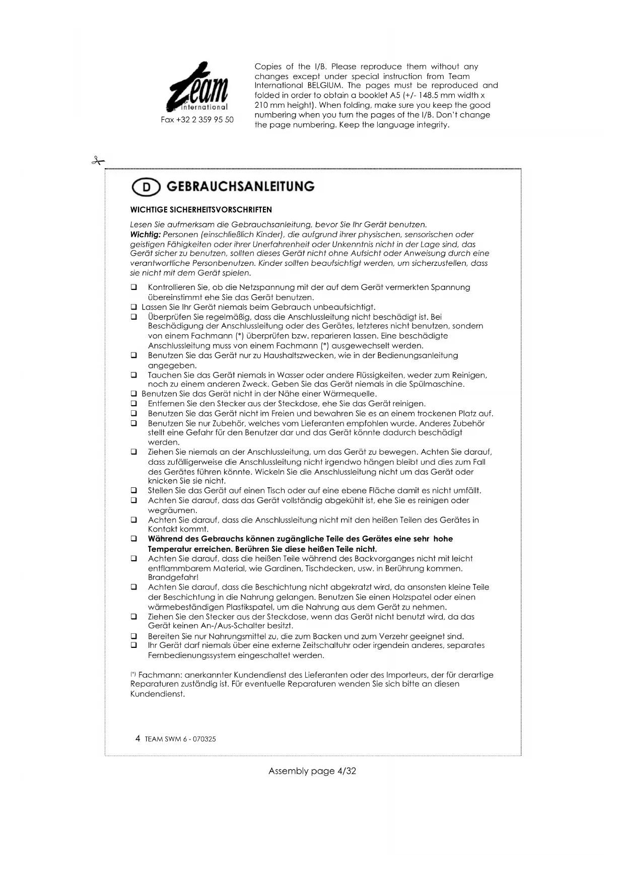 Zum Schutz unserer Umwelt und unserer Gesundheit sind Elektro- und Elektronik-Altgeräte nach bestimmten Regeln zu entsorgen. Dies fordert den Einsatz sowohl des Herstellers bzw. Lieferanten als auch des Verbrauchers. Aus diesem Grund darf dieses Gerät, wie das Symbol auf dem Typenschild bzw. auf der Verpackung zeigt, nicht in den unsortierten Restmüll gegeben werden. Der Verbraucher hat das Recht, dieses Gerät über kommunale Sammelstellen zu entsorgen; von dort aus wird die spezifische Behandlung, Verwertung bzw. das Recycling gem. den Erfordernissen der Richtlinie sichergestellt. Copies of the I/B. Please reproduce them without any changes except under special instruction from Team International BELGIUM. The pages must be reproduced and folded in order to obtain a booklet A5 (+/- 148.5 mm width x 210 mm height). When folding, make sure you keep the good numbering when you turn the pages of the I/B. Don’t change the page numbering. Keep the language integrity.