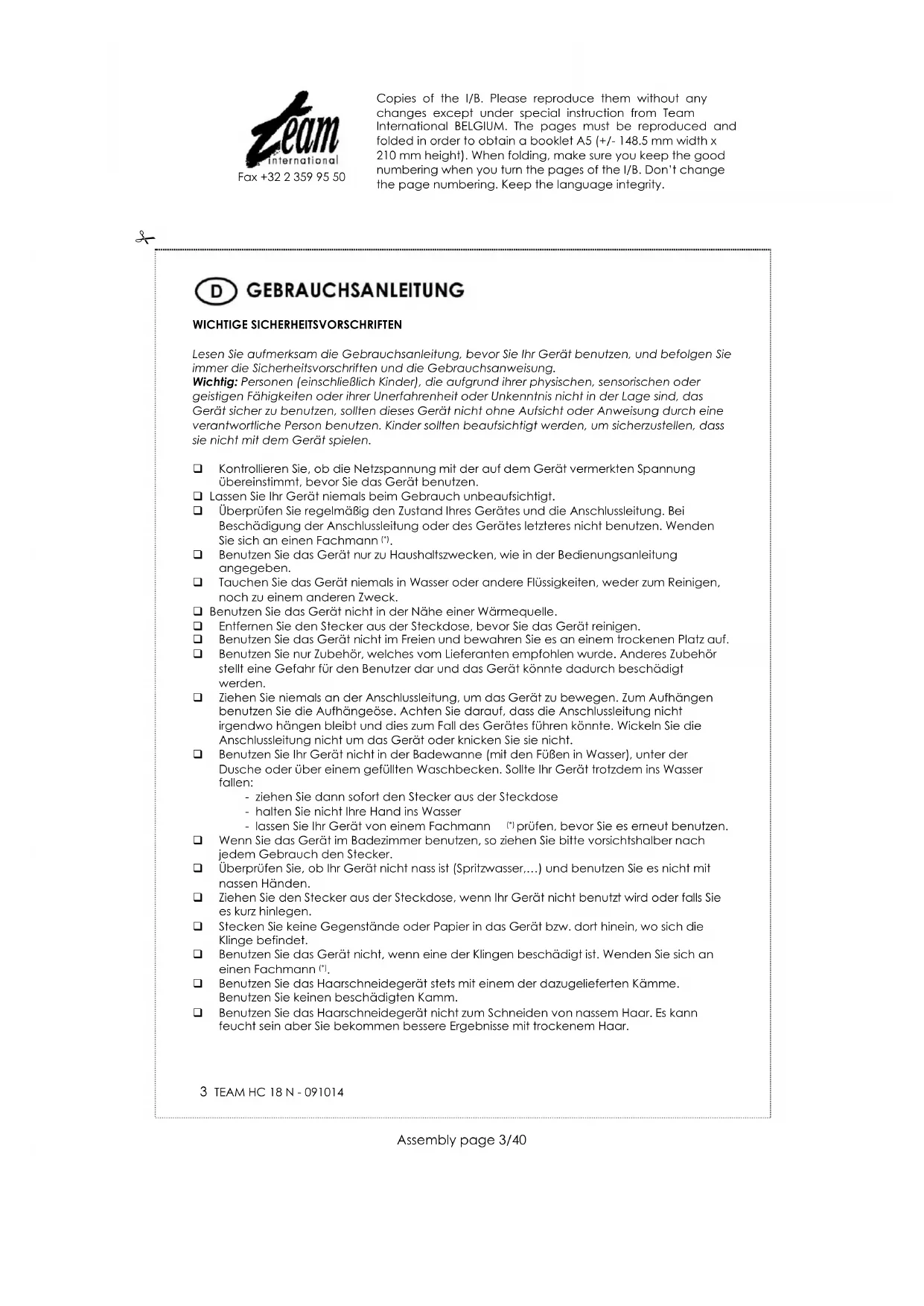 Benutzen Sie das Haarschneidegerät stets mit einem der dazugelieferten Kämme. Benutzen Sie keinen beschädigten Kamm. Benutzen Sie das Haarschneidegerät nicht zum Schneiden von nassem Haar. Es kann feucht sein aber Sie bekommen bessere Ergebnisse mit trockenem Haar. Copies of the I/B. Please reproduce them without any changes except under special instruction from Team International BELGIUM. The pages must be reproduced and folded in order to obtain a booklet A5 (+/- 148.5 mm width x 210 mm height). When folding, make sure you keep the good numbering when you turn the pages of the I/B. Don’t change the page numbering. Keep the language integrity.