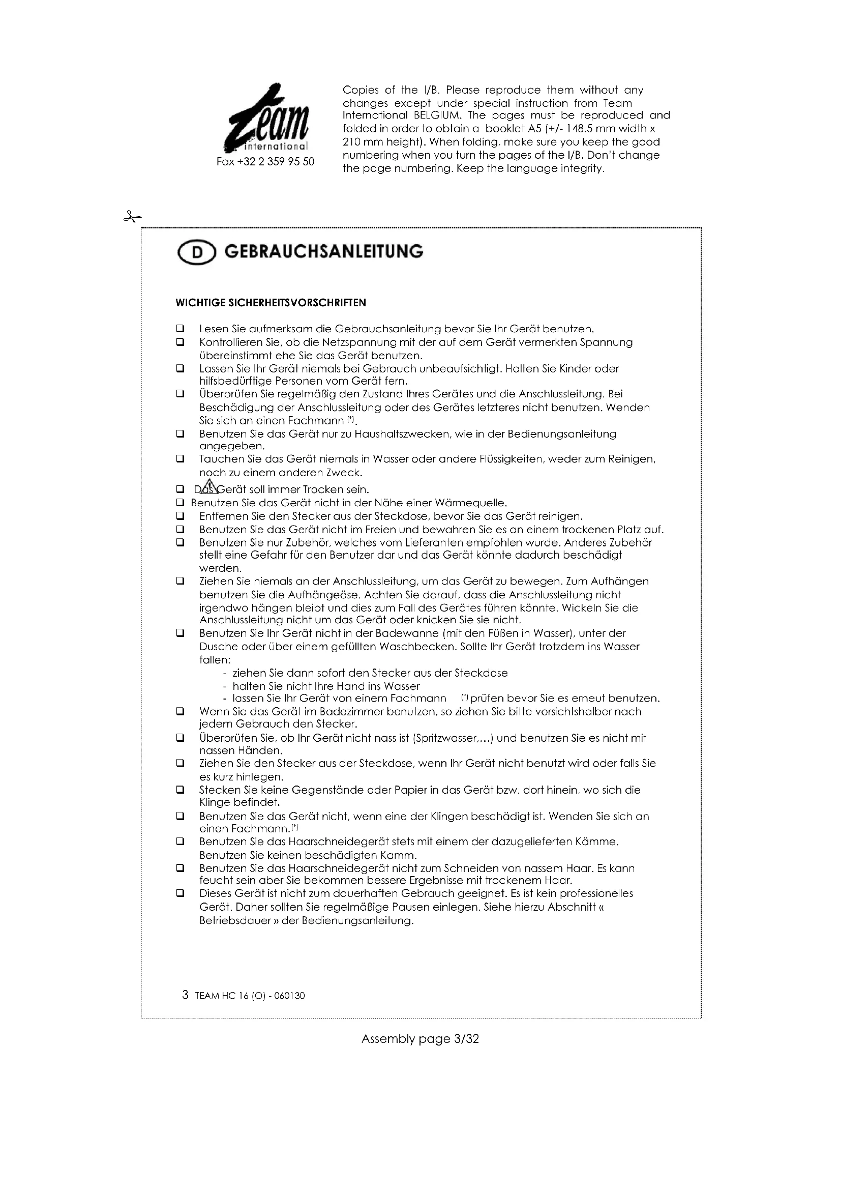 Benutzen Sie das Haarschneidegerät stets mit einem der dazugelieferten Kämme. Benutzen Sie keinen beschädigten Kamm. Benutzen Sie das Haarschneidegerät nicht zum Schneiden von nassem Haar. Es kann feucht sein aber Sie bekommen bessere Ergebnisse mit trockenem Haar. Dieses Gerät ist nicht zum dauerhaften Gebrauch geeignet. Es ist kein professionelles Gerät. Daher sollten Sie regelmäßige Pausen einlegen. Siehe hierzu Abschnitt « Betriebsdauer » der Bedienungsanleitung. Copies of the I/B. Please reproduce them without any changes except under special instruction from Team International BELGIUM. The pages must be reproduced and folded in order to obtain a booklet A5 (+/- 148.5 mm width x 210 mm height). When folding, make sure you keep the good numbering when you turn the pages of the I/B. Don’t change the page numbering. Keep the language integrity.