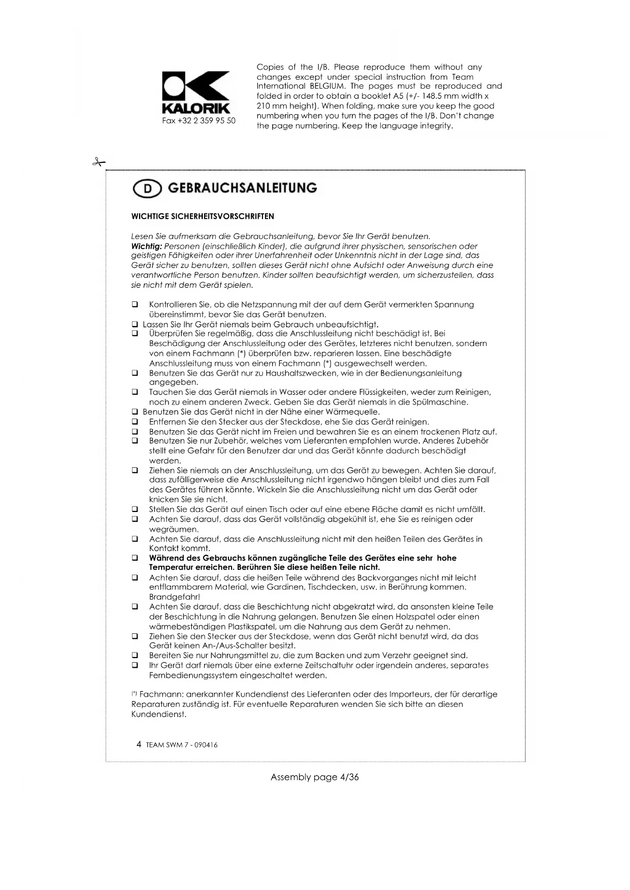 Zum Schutz unserer Umwelt und unserer Gesundheit sind Elektro- und Elektronik-Altgeräte nach bestimmten Regeln zu entsorgen. Dies fordert den Einsatz sowohl des Herstellers bzw. Lieferanten als auch des Verbrauchers. Aus diesem Grund darf dieses Gerät, wie das Symbol auf dem Typenschild bzw. auf der Verpackung zeigt, nicht in den unsortierten Restmüll gegeben werden. Der Verbraucher hat das Recht, dieses Gerät über kommunale Sammelstellen zu entsorgen; von dort aus wird die spezifische Behandlung, Verwertung bzw. das Recycling gem. den Erfordernissen der Richtlinie sichergestellt. Copies of the I/B. Please reproduce them without any changes except under special instruction from Team International BELGIUM. The pages must be reproduced and folded in order to obtain a booklet A5 (+/- 148.5 mm width x 210 mm height). When folding, make sure you keep the good numbering when you turn the pages of the I/B. Don’t change the page numbering. Keep the language integrity.
