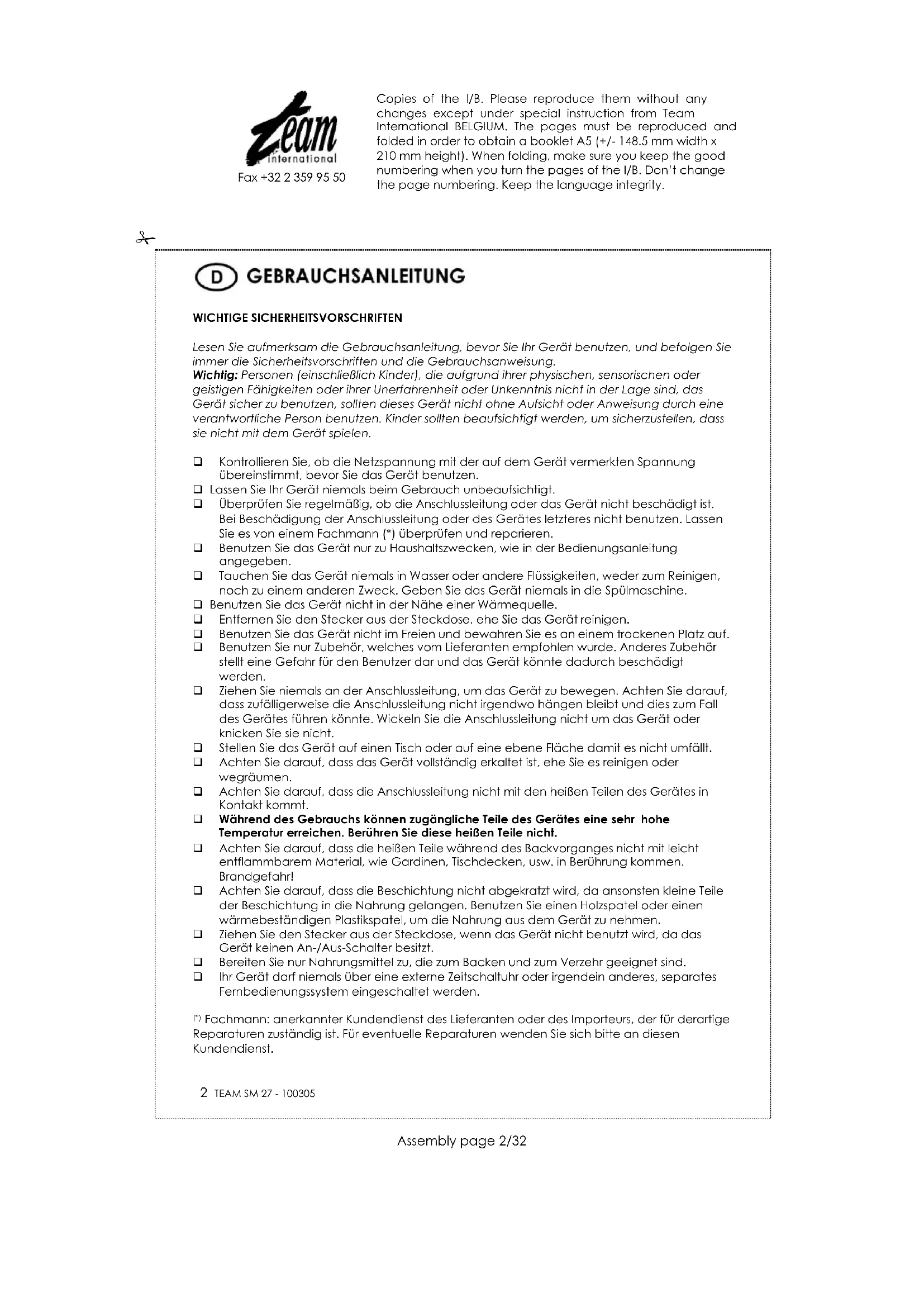 Laden Sie die Anleitung für Ihr Croque-Monsieur-Klammer kostenlos im PDF-Format! Finden Sie Ihr Handbuch SM 27 - TEAM und nehmen Sie Ihr elektronisches Gerät wieder in die Hand. Auf dieser Seite sind alle Dokumente veröffentlicht, die für die Verwendung Ihres Geräts notwendig sind. SM 27 von der Marke TEAM.
