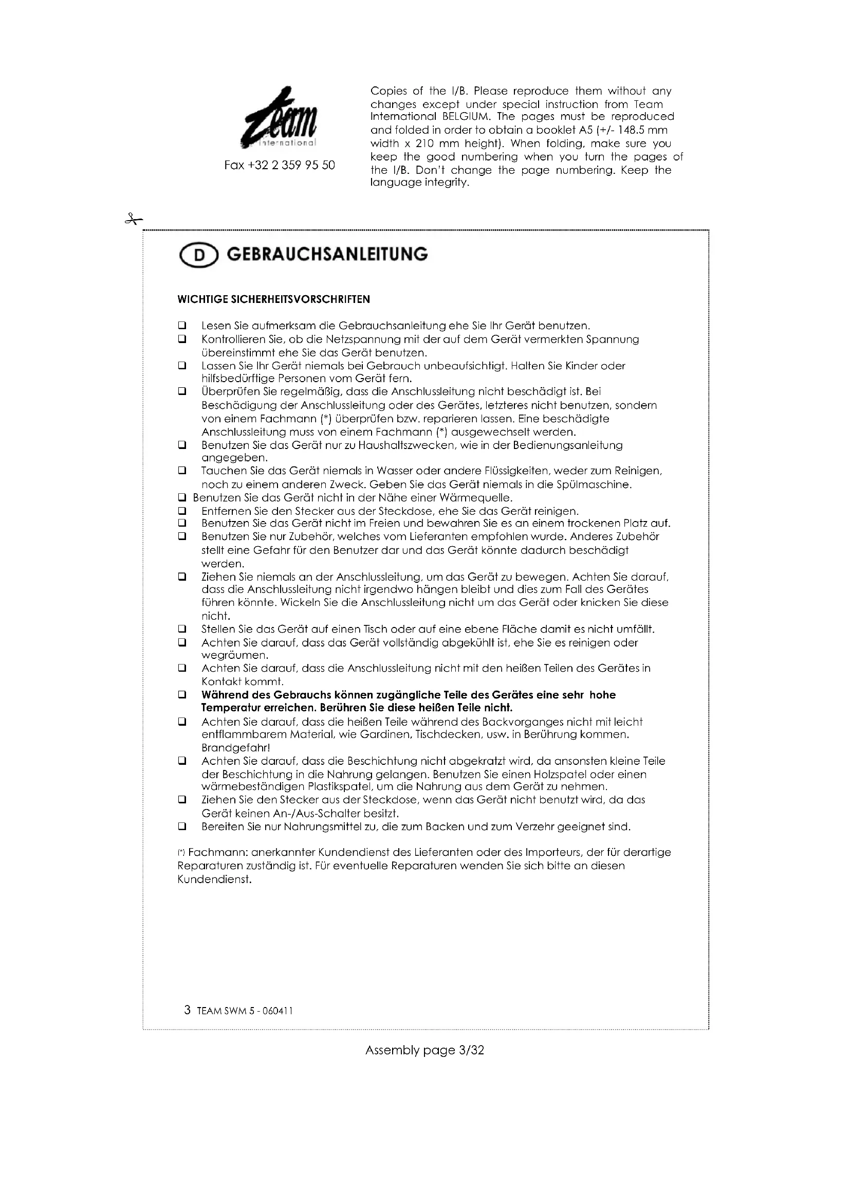 Zum Schutz unserer Umwelt und unserer Gesundheit sind Elektro- und Elektronik-Altgeräte nach bestimmten Regeln zu entsorgen. Dies fordert den Einsatz sowohl des Herstellers bzw. Lieferanten als auch des Verbrauchers. Aus diesem Grund darf dieses Gerät, wie das Symbol auf dem Typenschild bzw. auf der Verpackung zeigt, nicht in den unsortierten Restmüll gegeben werden. Der Verbraucher hat das Recht, dieses Gerät über kommunale Sammelstellen zu entsorgen; von dort aus wird die spezifische Behandlung, Verwertung bzw. das Recycling gem. den Erfordernissen der Richtlinie sichergestellt. Copies of the I/B. Please reproduce them without any changes except under special instruction from Team International BELGIUM. The pages must be reproduced and folded in order to obtain a booklet A5 (+/- 148.5 mm width x 210 mm height). When folding, make sure you keep the good numbering when you turn the pages of the I/B. Don’t change the page numbering. Keep the language integrity.