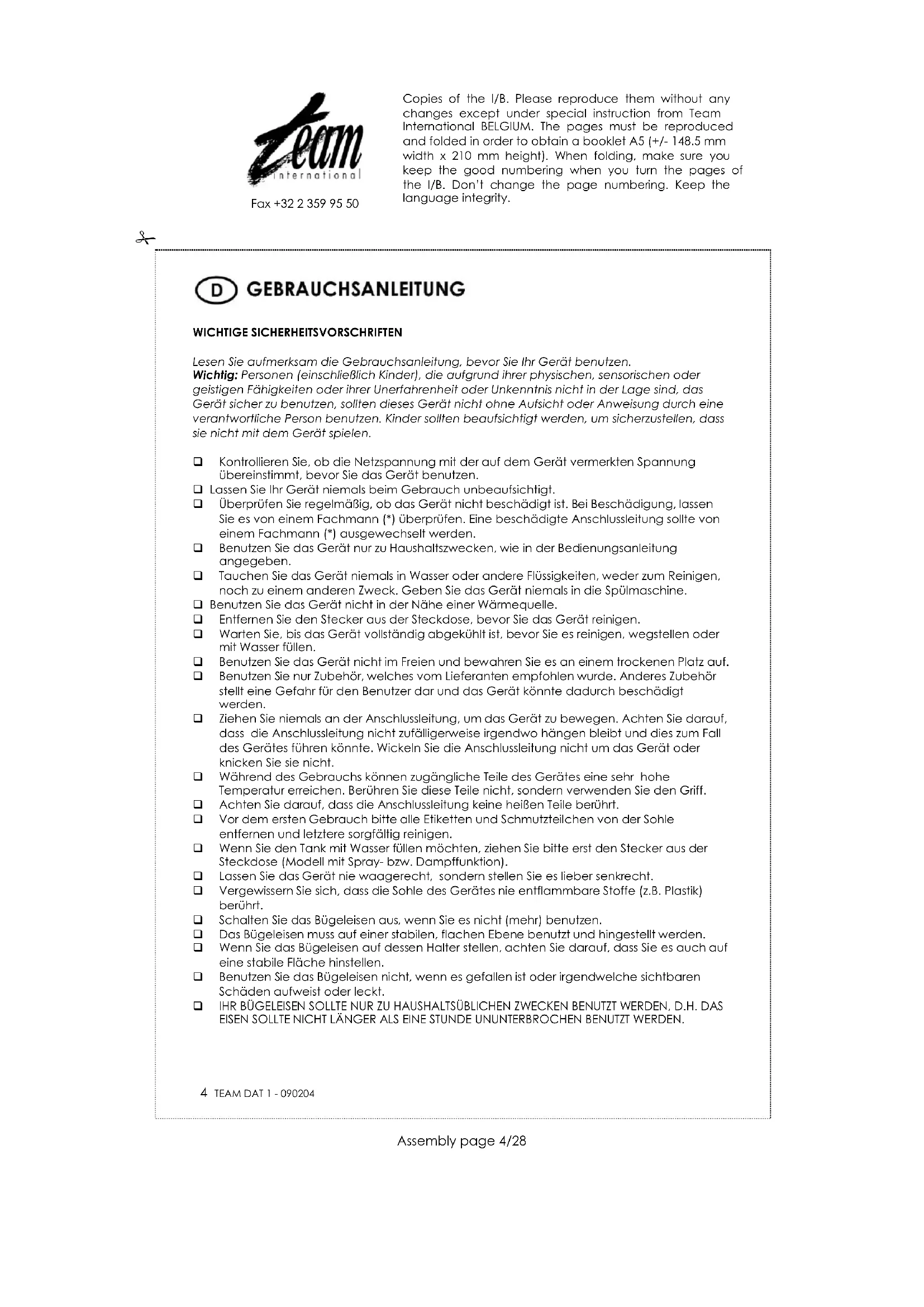 DAT 1 - Bügeleisen TEAM - Kostenlose Bedienungsanleitung