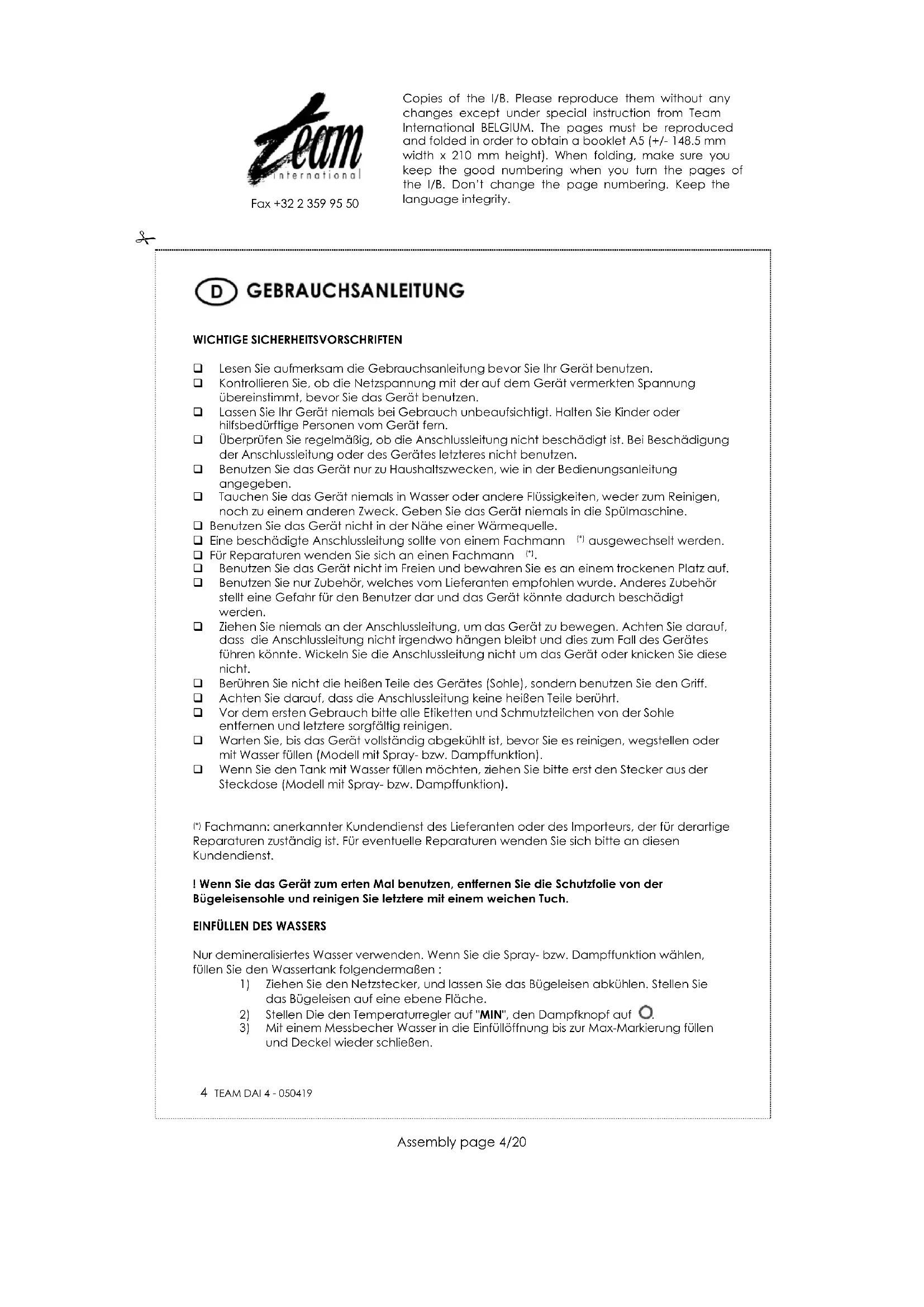 Fax +32 2 359 95 50 Stellen Sie das Bügeleisen aufrecht und warten Sie bis die Kontrolleuchte erlischt. Dann ist die eingestellte Temperatur auf der Sohle erreicht. ACHTUNG! Stellen Sie die Temperatur auf ‘Dampfbügeln’ ein. Wenn die Temperatur zu niedrig eingestellt ist, kann Wasser aus der Sohle entweichen. ACHTUNG! Überprüfen Sie das Etikett im Stoff bevor Sie beginnen zu bügeln. Gewisse Stoffe können durch Dampf oder Wasser beschädigt werden. SPRAY Erleichtert das Bügeln von dickeren Stoffen und schwer zu bügelnden Stellen. Den Sprayknopf fest drücken, um einen feinen Sprühnebel zu erzeugen. Der Sprayknopf kann immer benutzt werden, unabhängig von der Dampf- und Temperatureinstellung. DAMPFSTOß Drückt man auf den Dampfstoßknopf, so wird zusätzlicher Dampf erzeugt, durch den hartnäckige Falten entfernt werden können. REINIGUNG Nachdem Sie das Bügeleisen lange Zeit und regelmäßig benutzt haben (mindestens einmal pro Monat), ist es notwendig, es wie folgt zu reinigen: Füllen Sie den Wassertank bis zur Hälfte und stellen Sie das Gerät senkrecht. Heizen Sie das Bügeleisen auf maximale Temperatur auf, bis die Kontrollleuchte erlischt. Ziehen Sie den Stecker aus der Steckdose, drehen Sie den Dampfregler bis zur Selbstreinigungsposition , schütteln Sie das Bügeleisen waagerecht nach links und rechts. Drücken Sie während dieses Vorganges mehrmals auf den Dampfstoßknopf. Heißes Wasser und Dampf kommen aus der Sohle. So werden Staubpartikel entfernt. Sobald der Wassertank leer ist, drehen Sie den Dampfregler bis zur Position . Gießen Sie erneut Wasser in den Wassertank, heizen Sie das Gerät wieder auf, und bügeln Sie auf einem alten, aber sauberen Baumwolltuch. Auf diese Weise kann dass Wasser, das sich noch in der Sohle befand, verdampfen, und so zum Reinigungsvorgang beitragen. Reinigen Sie das Gehäuse des Bügeleisens mit einem feuchten Tuch.