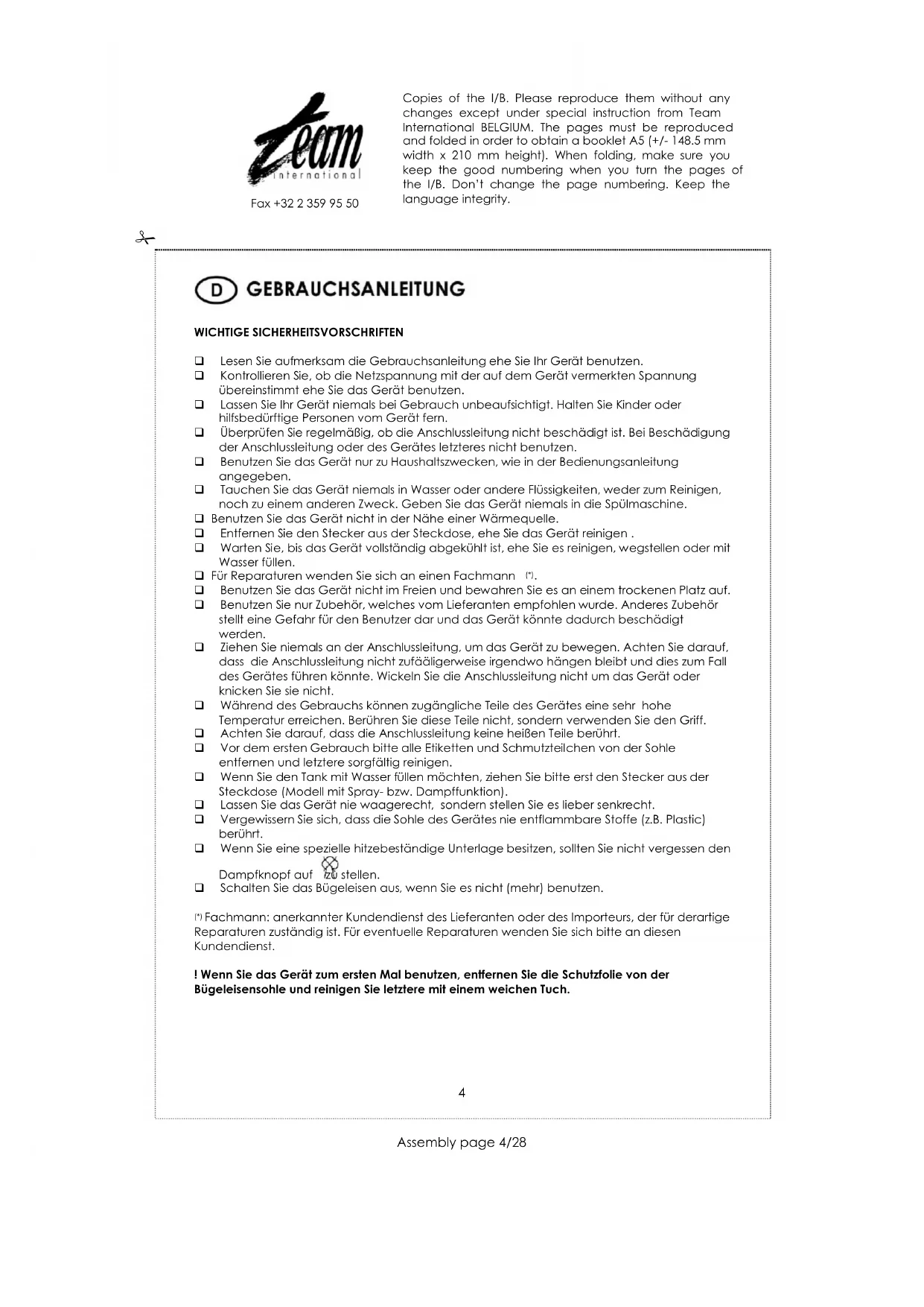 Fachmann: anerkannter Kundendienst des Lieferanten oder des Importeurs, der für derartige Reparaturen zuständig ist. Für eventuelle Reparaturen wenden Sie sich bitte an diesen Kundendienst. ! Wenn Sie das Gerät zum ersten Mal benutzen, entfernen Sie die Schutzfolie von der Bügeleisensohle und reinigen Sie letztere mit einem weichen Tuch. Copies of the I/B. Please reproduce them without any changes except under special instruction from Team International BELGIUM. The pages must be reproduced and folded in order to obtain a booklet A5 (+/- 148.5 mm width x 210 mm height). When folding, make sure you keep the good numbering when you turn the pages of the I/B. Don‟t change the page numbering. Keep the language integrity.