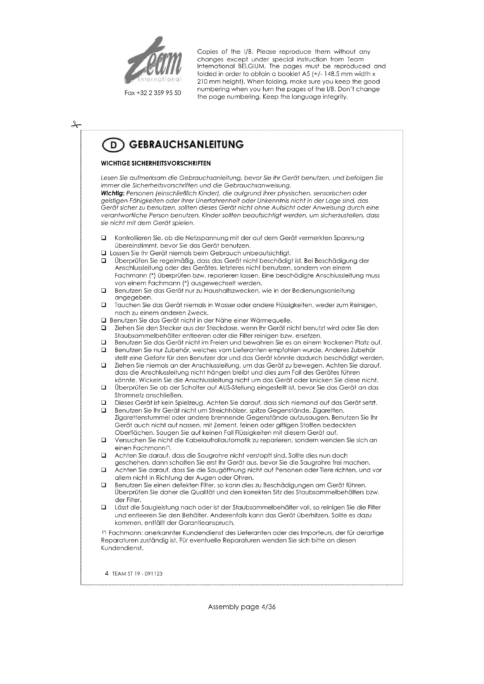Zum Schutz unserer Umwelt und unserer Gesundheit sind Elektro- und Elektronik-Altgeräte nach bestimmten Regeln zu entsorgen. Dies fordert den Einsatz sowohl des Herstellers bzw. Lieferanten als auch des Verbrauchers. Aus diesem Grund darf dieses Gerät, wie das Symbol auf dem Typenschild bzw. auf der Verpackung zeigt, nicht in den unsortierten Restmüll gegeben werden. Der Verbraucher hat das Recht, dieses Gerät über kommunale Sammelstellen zu entsorgen; von dort aus wird die spezifische Behandlung, Verwertung bzw. das Recycling gem. den Erfordernissen der Richtlinie sichergestellt. Copies of the I/B. Please reproduce them without any changes except under special instruction from Team International BELGIUM. The pages must be reproduced and folded in order to obtain a booklet A5 (+/- 148.5 mm width x 210 mm height). When folding, make sure you keep the good numbering when you turn the pages of the I/B. Don’t change the page numbering. Keep the language integrity.