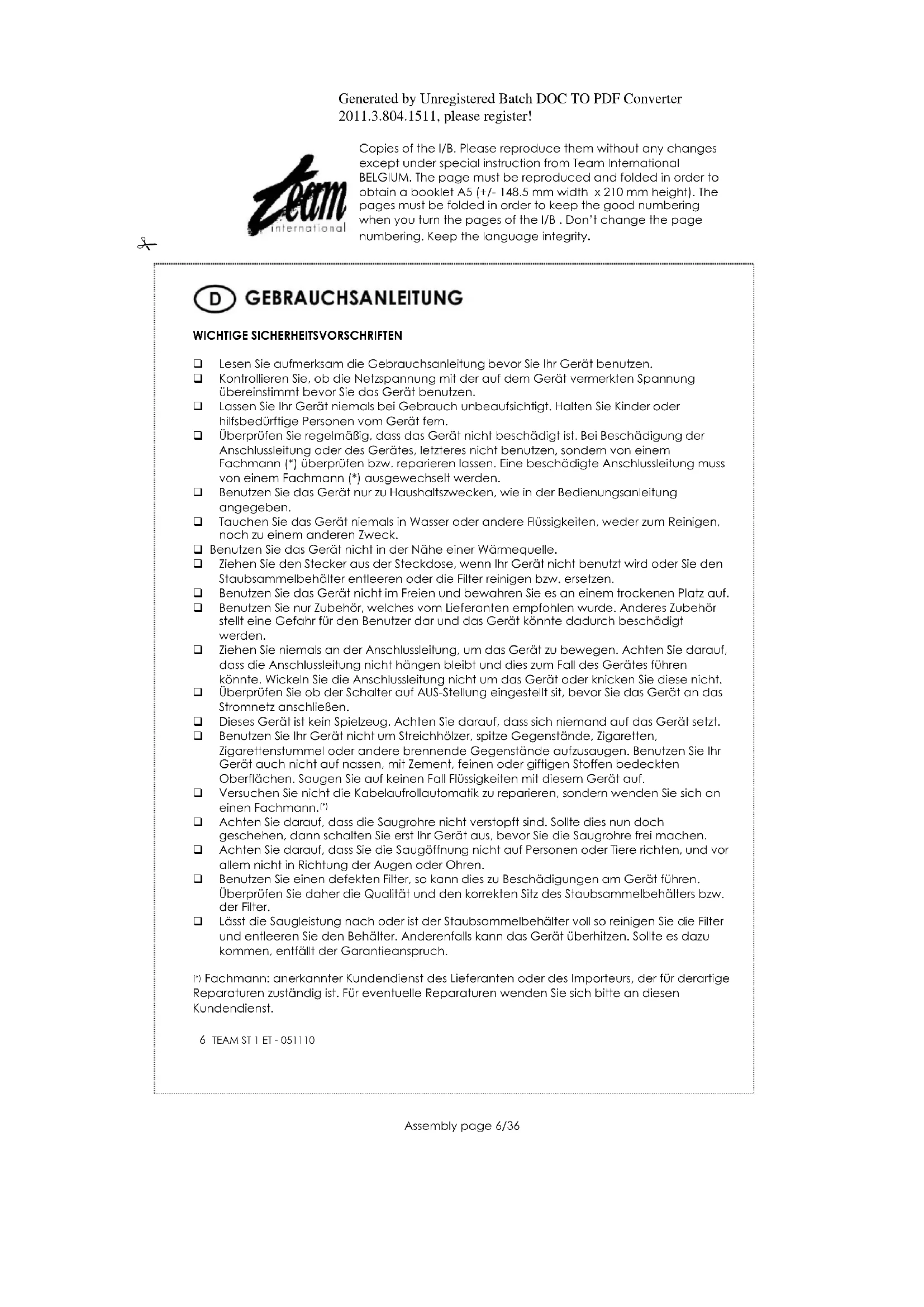 Zum Schutz unserer Umwelt und unserer Gesundheit, müssen Elektro- und Elektronik-Altgeräte nach bestimmten Regeln entsorgt werden. Dies fordert den Einsatz sowohl des Lieferanten als auch des Benutzers. Aus diesem Grund darf das Gerät, wie das Symbol auf dem Typenschild angibt, nicht als unsortierter Restmüll entsorgt werden, sondern es muss zu den kommunalen Sammelstellen gebracht werden, in denen die Altgeräte spezifisch behandelt, verwertet und recycelt werden.Generated by Unregistered Batch DOC TO PDF Converter 2011.3.804.1511, please register! Copies of the I/B. Please reproduce them without any changes except under special instruction from Team International BELGIUM. The page must be reproduced and folded in order to obtain a booklet A5 (+/- 148.5 mm width x 210 mm height). The pages must be folded in order to keep the good numbering when you turn the pages of the I/B . Don‟t change the page numbering. Keep the language integrity.