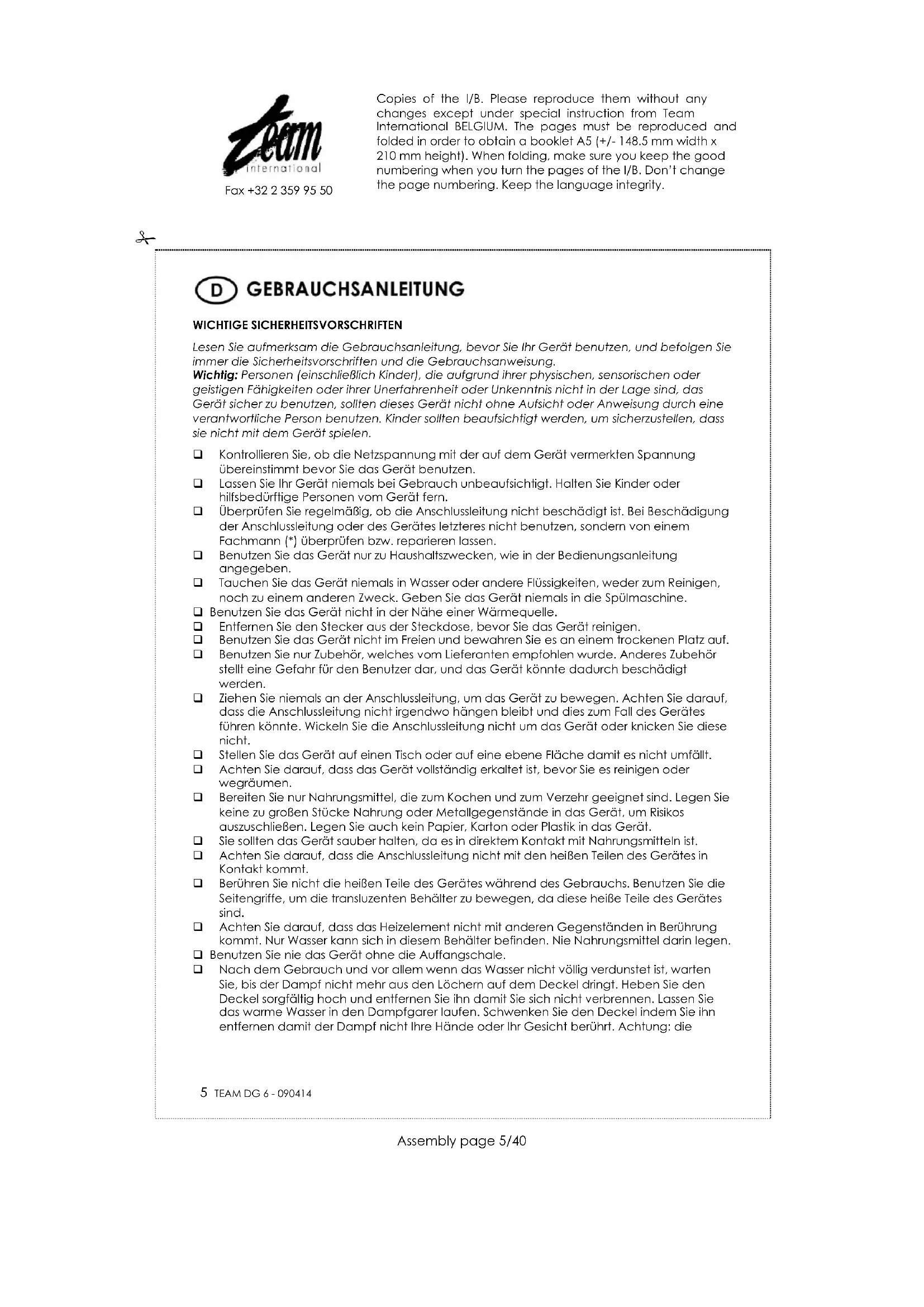 Stellen Sie sicher, dass der Stecker des Geräts nicht eingesteckt ist. Füllen Sie den Wassertank mit kaltem Wasser. Sie können den Wassertank füllen, indem Sie Wasser in die Füllöffnung an den Griffen gießen (siehe Seite 4). Die Wassermenge wird von der benötigten Kochzeit abhängen. Beachten Sie jedoch den minimalen und den maximalen Wasserstand. Bei Nichtbeachtung kann das Gerät beschädigt werden. Keine Kräuter, Gewürze oder andere Flüssigkeiten wie Wein oder Brühe zum Wasser des Wassertankes hinzufügen. Vergewissern Sie sich, dass der Boden der Körbe richtig festsitzt, und legen Sie die zum Kochenden Speisen in die verschiedenen Körbe. Keine Gewürze, Kräuter usw. hinzufügen bis der Kochvorgang beendet ist. Achten Sie darauf, dass der Schutz des Heizelementes am Platz ist, und richtig festsitzt. Stellen Sie dann die Auffangschale auf den Wassertank, und schichten Sie die Körbe übereinander auf, und achten Sie dabei, dass der größte Korb sich immer obenan befindet. Die Größe der Körbe ist mit Punkten auf einem der Griffe jedes Korbes angedeutet. Der kleinste Korb hat einen Punkt, der größte Korb hat drei Punkte. Wenn Sie einen Korb über den mittelgroßen Korb schichten möchten, brauchen Sie zuerst den Plastikring auf den Rand des mittelgroßen Korbes aufzusetzen, sonst ist es unmöglich die Körbe richtig übereinander zu schichten.Achtung: Benutzen Sie immer die Seitengriffe um die Körbe zu bewegen. Drücken Sie nie auf den Boden der Körbe, da dieser sich lösen könnte. Achten Sie darauf, dass die Körbe gut eingestellt sind. Wenn die Körbe schlecht eingestellt sind, kann der Dampf aus dem Gerät durch die Seiten dringen und Sie verbrennen. Legen Sie den Deckel auf den oberen Dampfkorb. BEDIENEN SIE DIESES GERÄT NICHT OHNE ABDECKUNG - DAMPF ENTSTEHT WÄHREND DES GEBRAUCHS. Stecken Sie den Stecker in die Steckdose. Stellen Sie die Zeitschaltuhr ein, indem Sie den Knopf der Zeitschaltuhr im Uhrzeigersinn zur gewünschten Zeiteinstellung drehen. Die Kontrollleuchte geht an und zeigt, dass das Gerät in Betrieb ist. Copies of the I/B. Please reproduce them without any changes except under special instruction from Team International BELGIUM. The pages must be reproduced and folded in order to obtain a booklet A5 (+/- 148.5 mm width x 210 mm height). When folding, make sure you keep the good numbering when you turn the pages of the I/B. Don’t change the page numbering. Keep the language integrity.