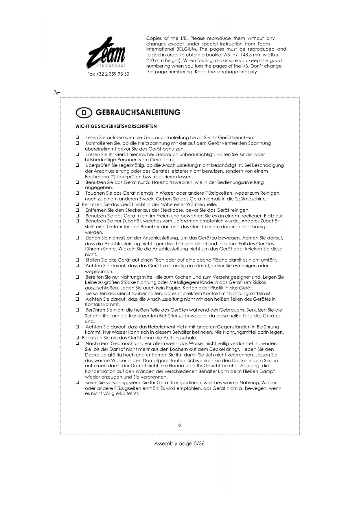 WICHTIGE SICHERHEITSVORSCHRIFTEN Lesen Sie aufmerksam die Gebrauchsanleitung bevor Sie Ihr Gerät benutzen. Kontrollieren Sie, ob die Netzspannung mit der auf dem Gerät vermerkten Spannung übereinstimmt bevor Sie das Gerät benutzen. Lassen Sie Ihr Gerät niemals bei Gebrauch unbeaufsichtigt. Halten Sie Kinder oder hilfsbedürftige Personen vom Gerät fern. Überprüfen Sie regelmäßig, ob die Anschlussleitung nicht beschädigt ist. Bei Beschädigung der Anschlussleitung oder des Gerätes letzteres nicht benutzen, sondern von einem Fachmann (*) überprüfen bzw. reparieren lassen. Benutzen Sie das Gerät nur zu Haushaltszwecken, wie in der Bedienungsanleitung angegeben. Tauchen Sie das Gerät niemals in Wasser oder andere Flüssigkeiten, weder zum Reinigen, noch zu einem anderen Zweck. Geben Sie das Gerät niemals in die Spülmaschine. Benutzen Sie das Gerät nicht in der Nähe einer Wärmequelle. Entfernen Sie den Stecker aus der Steckdose, bevor Sie das Gerät reinigen. Benutzen Sie das Gerät nicht im Freien und bewahren Sie es an einem trockenen Platz auf. Benutzen Sie nur Zubehör, welches vom Lieferanten empfohlen wurde. Anderes Zubehör stellt eine Gefahr für den Benutzer dar, und das Gerät könnte dadurch beschädigt werden. Ziehen Sie niemals an der Anschlussleitung, um das Gerät zu bewegen. Achten Sie darauf, dass die Anschlussleitung nicht irgendwo hängen bleibt und dies zum Fall des Gerätes führen könnte. Wickeln Sie die Anschlussleitung nicht um das Gerät oder knicken Sie diese nicht. Stellen Sie das Gerät auf einen Tisch oder auf eine ebene Fläche damit es nicht umfällt. Achten Sie darauf, dass das Gerät vollständig erkaltet ist, bevor Sie es reinigen oder wegräumen. Bereiten Sie nur Nahrungsmittel, die zum Kochen und zum Verzehr geeignet sind. Legen Sie keine zu großen Stücke Nahrung oder Metallgegenstände in das Gerät, um Risikos auszuschließen. Legen Sie auch kein Papier, Karton oder Plastik in das Gerät. Sie sollten das Gerät sauber halten, da es in direktem Kontakt mit Nahrungsmitteln ist. Achten Sie darauf, dass die Anschlussleitung nicht mit den heißen Teilen des Gerätes in Kontakt kommt. Berühren Sie nicht die heißen Teile des Gerätes während des Gebrauchs. Benutzen Sie die Seitengriffe, um die transluzenten Behälter zu bewegen, da diese heiße Teile des Gerätes sind. Achten Sie darauf, dass das Heizelement nicht mit anderen Gegenständen in Berührung kommt. Nur Wasser kann sich in diesem Behälter befinden. Nie Nahrungsmittel darin legen. Benutzen Sie nie das Gerät ohne die Auffangschale. Nach dem Gebrauch und vor allem wenn das Wasser nicht völlig verdunstet ist, warten Sie, bis der Dampf nicht mehr aus den Löchern auf dem Deckel dringt. Heben Sie den Deckel sorgfältig hoch und entfernen Sie ihn damit Sie sich nicht verbrennen. Lassen Sie das warme Wasser in den Dampfgarer laufen. Schwenken Sie den Deckel indem Sie ihn entfernen damit der Dampf nicht Ihre Hände oder Ihr Gesicht berührt. Achtung: die Kondensation auf den Wänden der verschiedenen Behälter kann beim Fließen Dampf wieder erzeugen und Sie verbrennen. Seien Sie vorsichtig, wenn Sie Ihr Gerät transportieren, welches warme Nahrung, Wasser oder andere Flüssigkeiten enthält. Es wird empfohlen, das Gerät nicht zu bewegen, wenn es nicht völlig erkaltet ist. Copies of the I/B. Please reproduce them without any changes except under special instruction from Team International BELGIUM. The pages must be reproduced and folded in order to obtain a booklet A5 (+/- 148.5 mm width x 210 mm height). When folding, make sure you keep the good numbering when you turn the pages of the I/B. Don’t change the page numbering. Keep the language integrity.