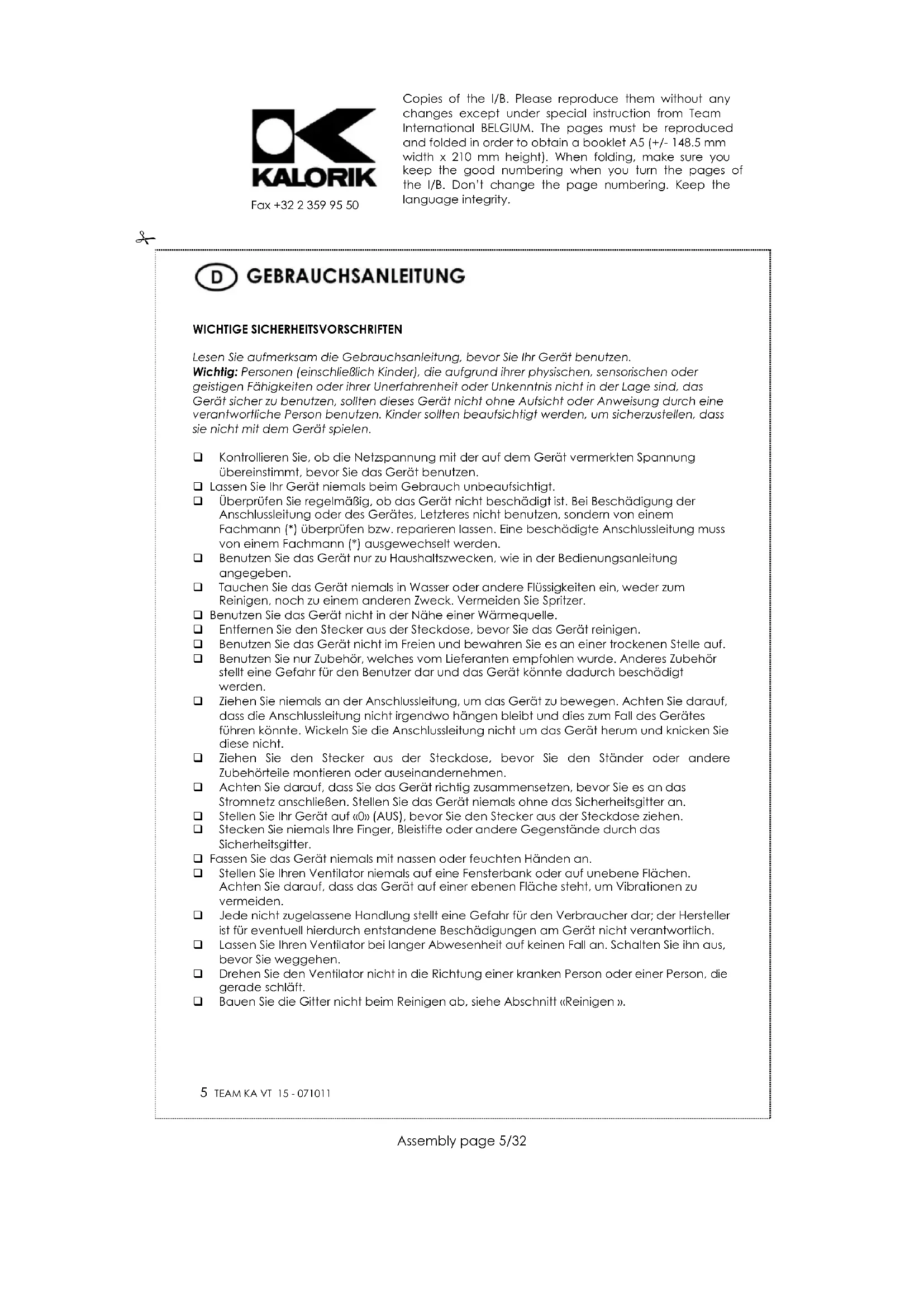 Zum Schutz unserer Umwelt und unserer Gesundheit sind Elektro- und Elektronik-Altgeräte nach bestimmten Regeln zu entsorgen. Dies fordert den Einsatz sowohl des Herstellers bzw. Lieferanten als auch des Verbrauchers. Aus diesem Grund darf dieses Gerät, wie das Symbol auf dem Typenschild bzw. auf der Verpackung zeigt, nicht in den unsortierten Restmüll gegeben werden. Der Verbraucher hat das Recht, dieses Gerät über kommunale Sammelstellen zu entsorgen; von dort aus wird die spezifische Behandlung, Verwertung bzw. das Recycling gem. den Erfordernissen der Richtlinie sichergestellt. Copies of the I/B. Please reproduce them without any changes except under special instruction from Team International BELGIUM. The pages must be reproduced and folded in order to obtain a booklet A5 (+/- 148.5 mm width x 210 mm height). When folding, make sure you keep the good numbering when you turn the pages of the I/B. Don’t change the page numbering. Keep the language integrity.