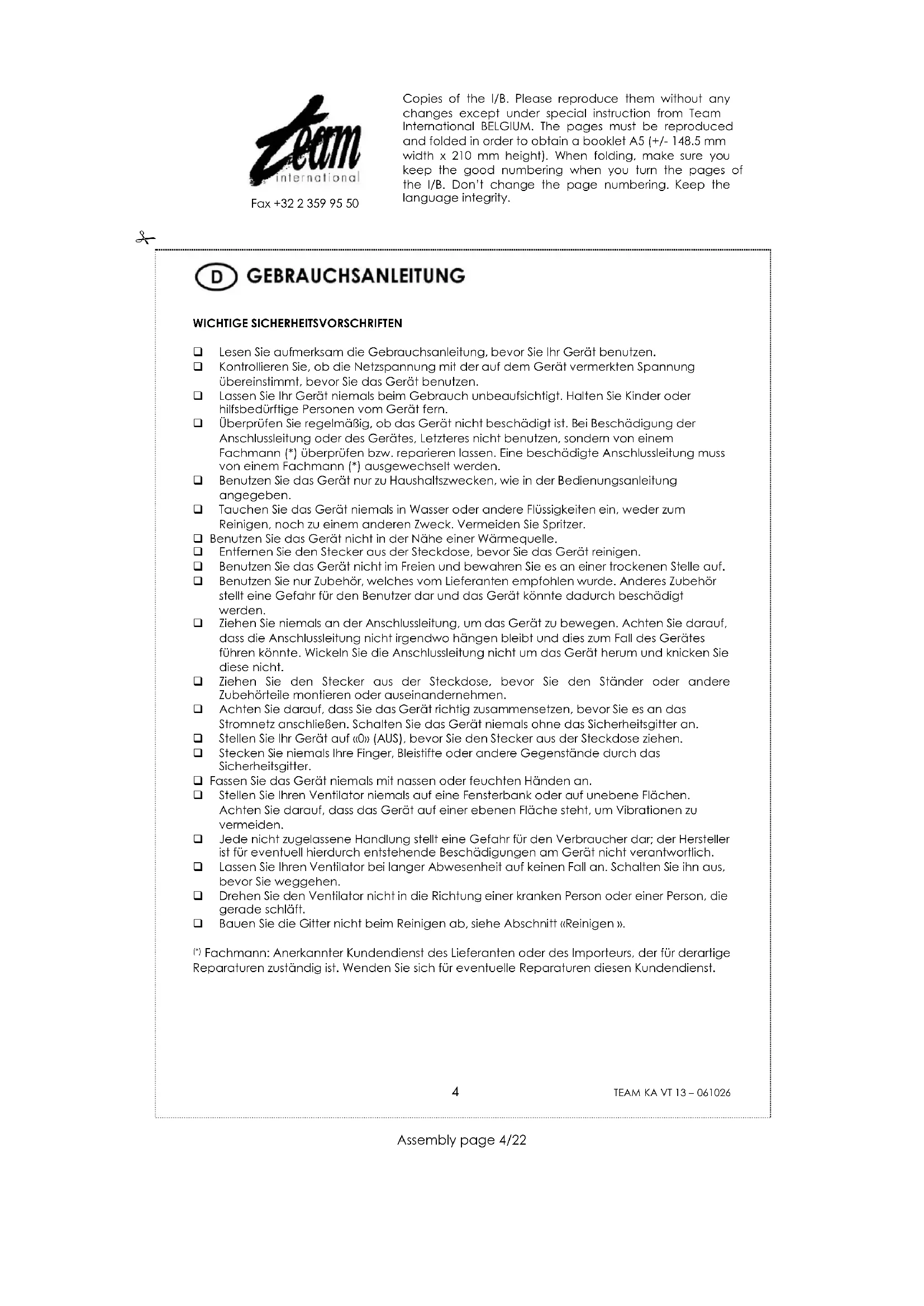 KA VT 13 - Ventilator TEAM - Kostenlose Bedienungsanleitung