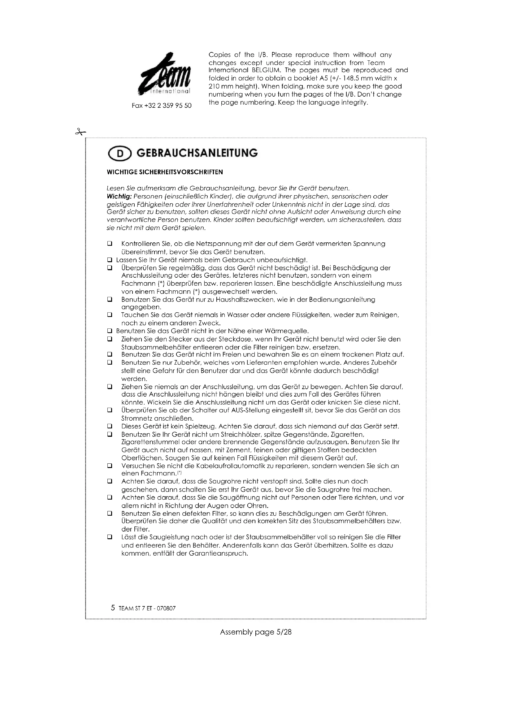 Achten Sie darauf, dass die Saugrohre nicht verstopft sind. Sollte dies nun doch geschehen, dann schalten Sie erst Ihr Gerät aus, bevor Sie die Saugrohre frei machen. Achten Sie darauf, dass Sie die Saugöffnung nicht auf Personen oder Tiere richten, und vor allem nicht in Richtung der Augen oder Ohren. Benutzen Sie einen defekten Filter, so kann dies zu Beschädigungen am Gerät führen. Überprüfen Sie daher die Qualität und den korrekten Sitz des Staubsammelbehälters bzw. der Filter. Lässt die Saugleistung nach oder ist der Staubsammelbehälter voll so reinigen Sie die Filter und entleeren Sie den Behälter. Anderenfalls kann das Gerät überhitzen. Sollte es dazu kommen, entfällt der Garantieanspruch. Copies of the I/B. Please reproduce them without any changes except under special instruction from Team International BELGIUM. The pages must be reproduced and folded in order to obtain a booklet A5 (+/- 148.5 mm width x 210 mm height). When folding, make sure you keep the good numbering when you turn the pages of the I/B. Don’t change the page numbering. Keep the language integrity.