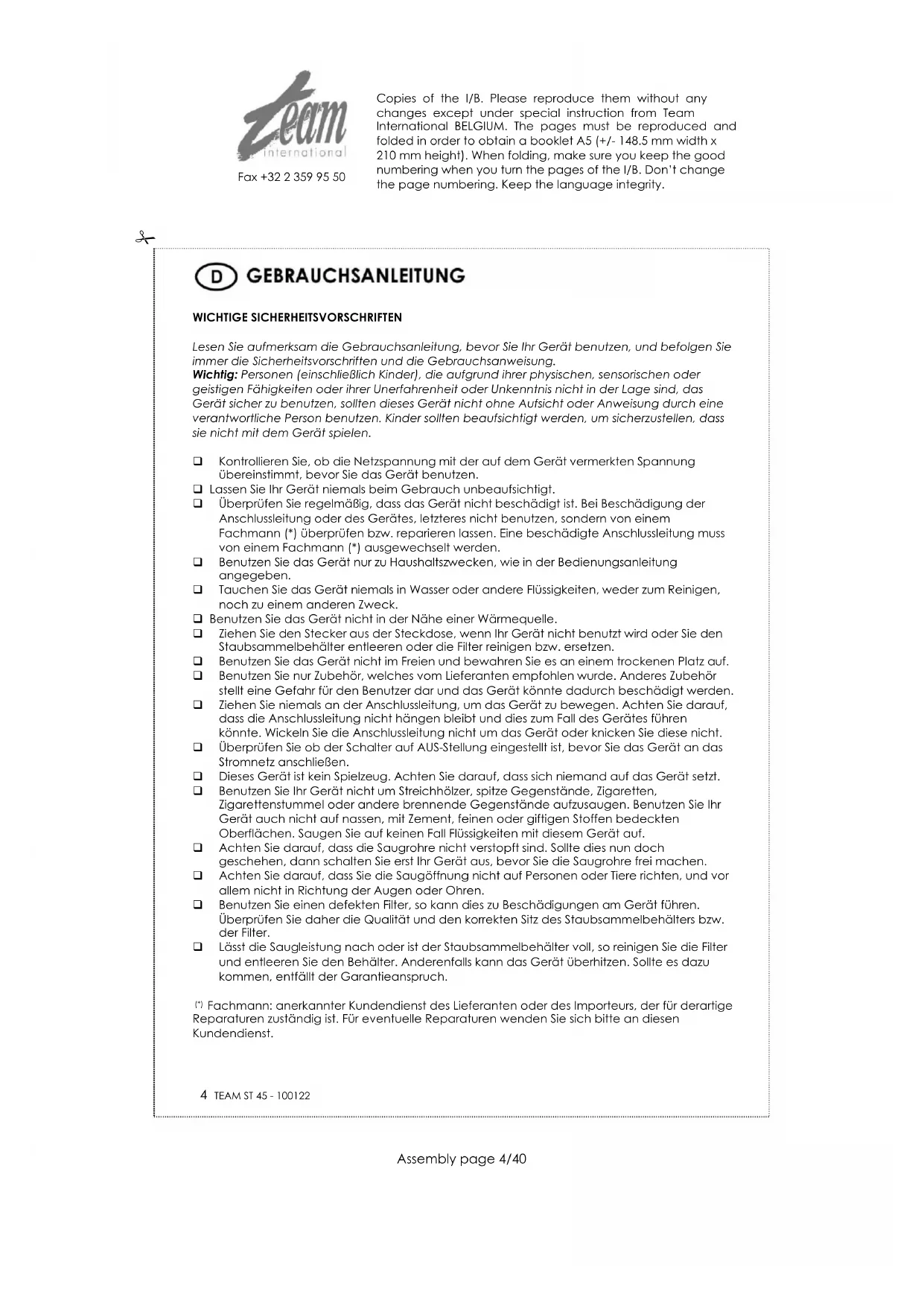 Fax +32 2 359 95 50 Aus diesem Grund darf dieses Gerät, wie das Symbol auf dem Typenschild bzw. auf der Verpackung zeigt, nicht in den unsortierten Restmüll gegeben werden. Der Verbraucher hat das Recht, dieses Gerät über kommunale Sammelstellen zu entsorgen; von dort aus wird die spezifische Behandlung, Verwertung bzw. das Recycling gem. den Erfordernissen der Richtlinie sichergestellt. Copies of the I/B. Please reproduce them without any changes except under special instruction from Team International BELGIUM. The pages must be reproduced and folded in order to obtain a booklet A5 (+/- 148.5 mm width x 210 mm height). When folding, make sure you keep the good numbering when you turn the pages of the I/B. Don‟t change the page numbering. Keep the language integrity.