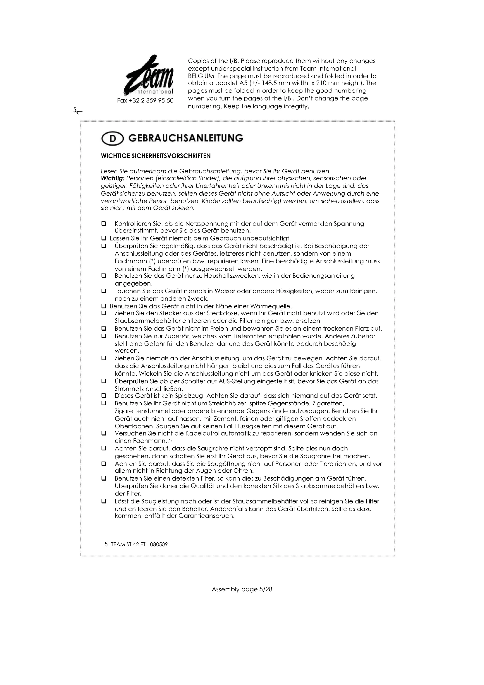 - Wir empfehlen Ihnen den Staubsammelbehälter nach jedem Gebrauch zu entleeren 6 TEAM ST 42 ET -080509