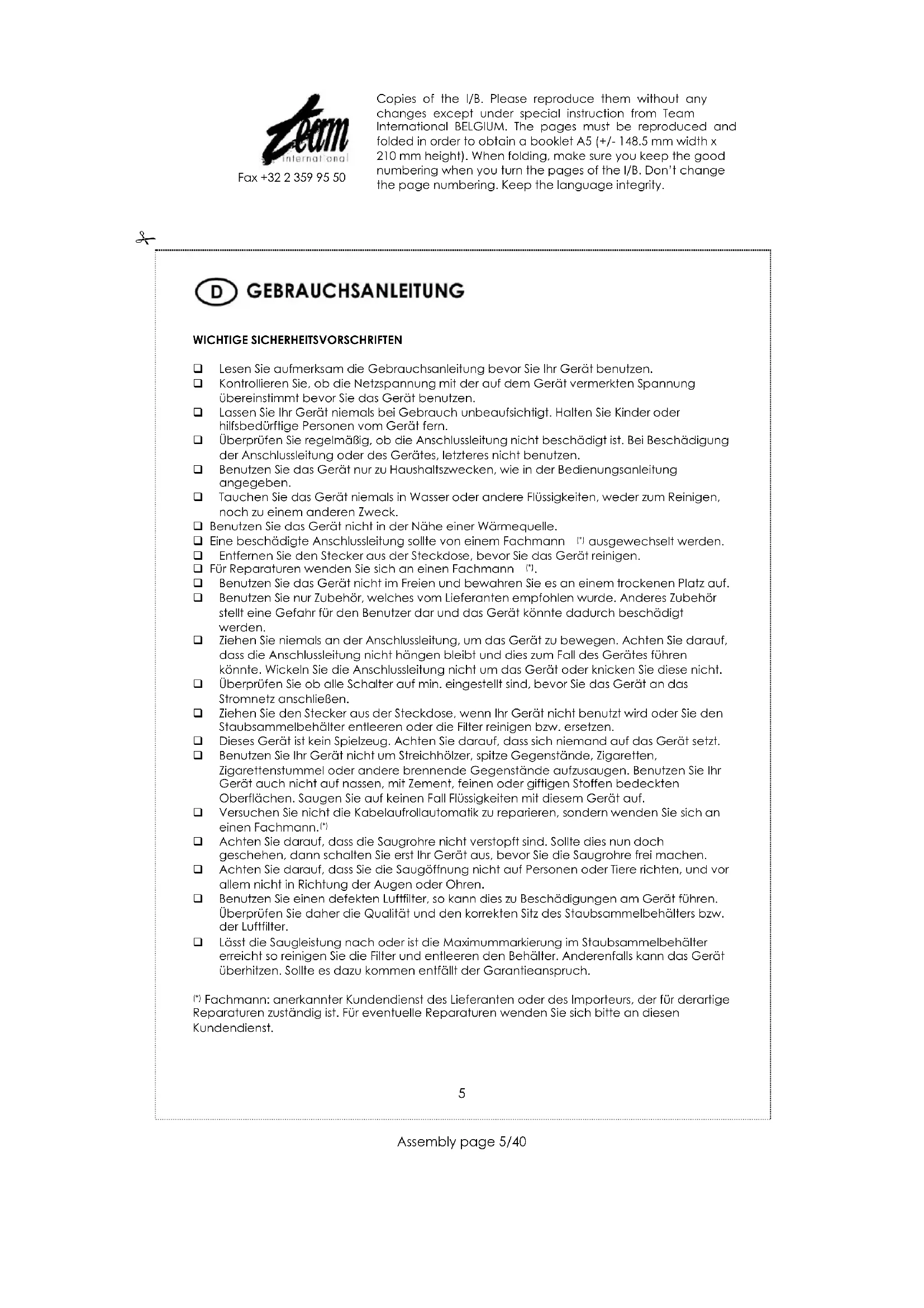 1) Fachmann: anerkannter Kundendienst des Lieferanten oder des Importeurs, der für derartige Reparaturen zuständig ist. Für eventuelle Reparaturen wenden Sie sichitte an diesen Kundendienst.