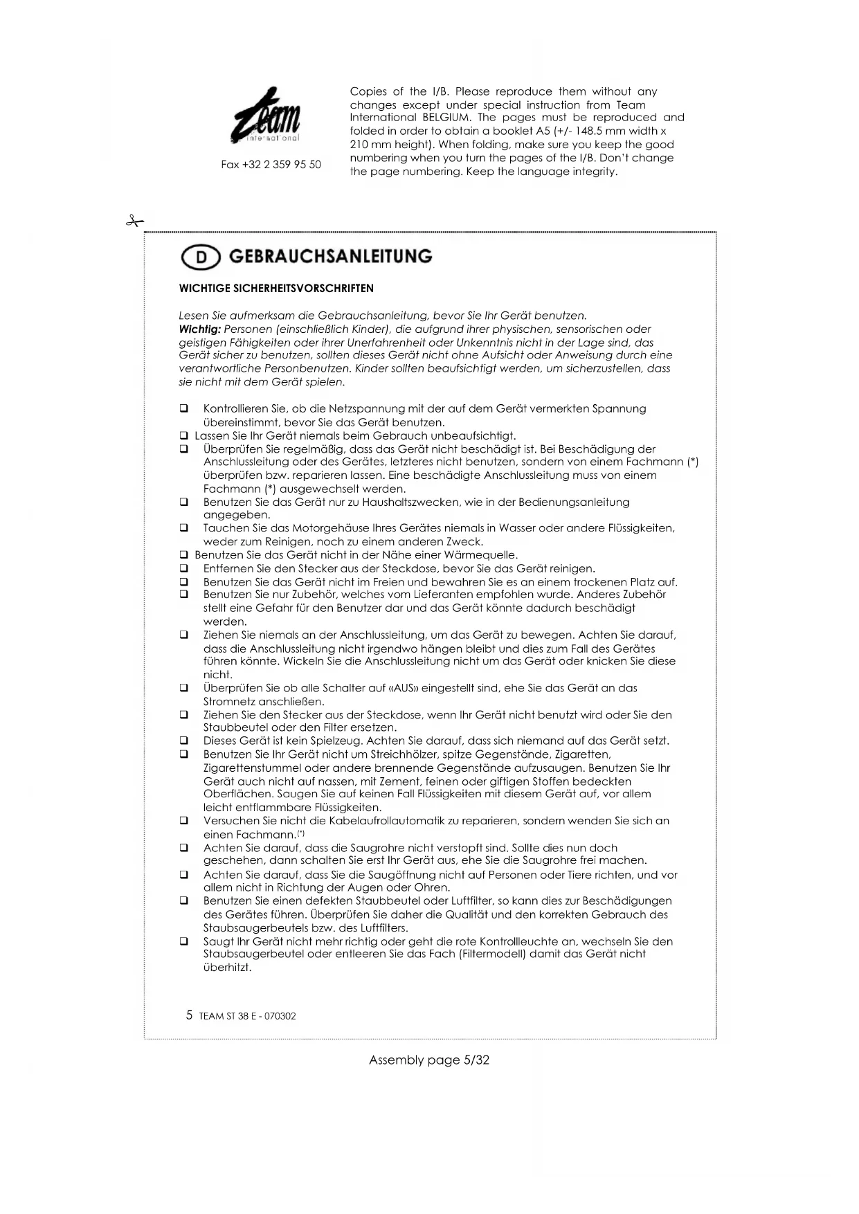 Zum Schutz unserer Umwelt und unserer Gesundheit sind Elektro- und Elektronik-Altgeräte nach bestimmten Regeln zu entsorgen. Dies fordert den Einsatz sowohl des Herstellers bzw. Lieferanten als auch des Verbrauchers. Aus diesem Grund darf dieses Gerät, wie das Symbol auf dem Typenschild bzw. auf der Verpackung zeigt, nicht in den unsortierten Restmüll gegeben werden. Der Verbraucher hat das Recht, dieses Gerät über kommunale Sammelstellen zu entsorgen; von dort aus wird die spezifische Behandlung, Verwertung bzw. das Recycling gem. den Erfordernissen der Richtlinie sichergestellt. Copies of the I/B. Please reproduce them without any changes except under special instruction from Team International BELGIUM. The pages must be reproduced and folded in order to obtain a booklet A5 (+/- 148.5 mm width x 210 mm height). When folding, make sure you keep the good numbering when you turn the pages of the I/B. Don’t change the page numbering. Keep the language integrity.